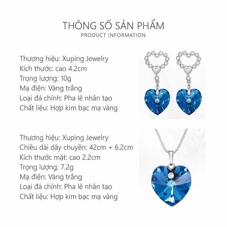 • MÔ TẢ SẢN PHẨM: - Thương hiệu: Xuping Jewelry - Bộ Sản Phẩm Gồm: 1 Dây Chuyền, 1 Mặt Dây Chuyền, 1 Đôi Bông Tai - Chất liệu: Hợp Kim Bạc, Mạ Điện Vàng Trắng - Giới tính: Nữ - Kích thước bộ sản phẩm: + Hoa tai: cao 4.2cm, trọng lượng: 10g + Dây chuyền: Dây chuyền dài: 42cm + 6.2cm xích nới lỏng, trọng lượng: 1.2g + Mặt dây chuyền: cao 4.2cm, trọng lượng: 6.0g - Loại đá chính: Pha lê nhân tạo - Mạ điện, bền bỉ, không hen gỉ, không ngứa, không dị ứng - Dịp tặng quà: Sinh nhật, Tình yêu, Ngày kỷ niệm, Các dịp lễ tết