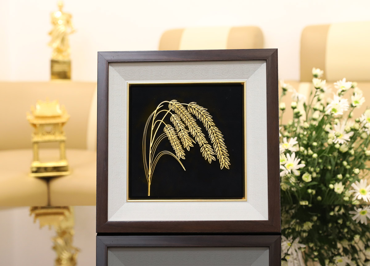 Lấy cảm hứng đó, đội ngũ thiết kế Golden Gift Việt Nam đã chế tác tranh bông lúa mạ vàng - biểu tượng cho nền văn hóa Việt. Hình ảnh những bông lúa đan vào nhau, hạt lúa tròn mẩy, lấp lánh như những hạt vàng, vừa sang trọng, vừa đẹp đẽ. Từng đường nét trên bông lúa, lá lúa, hạt lúa cũng được chế tác tỉ mỉ và sinh động, như bông lúa ngoài đời thực.