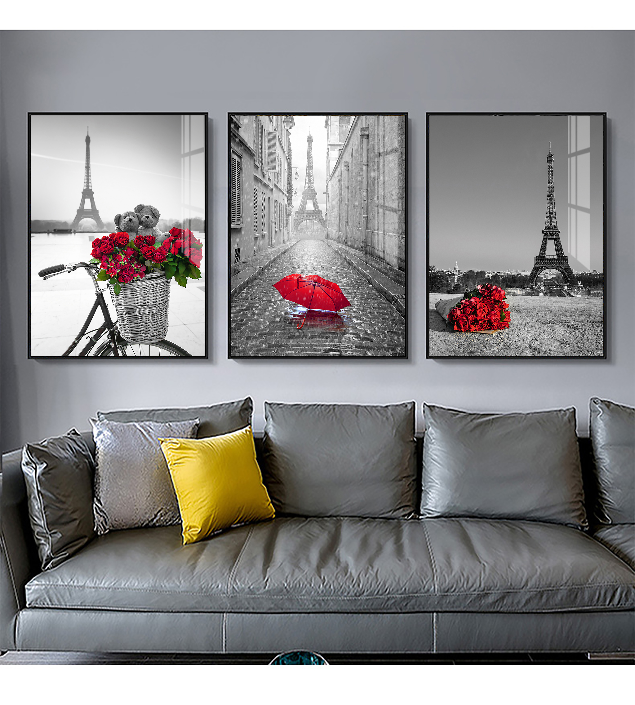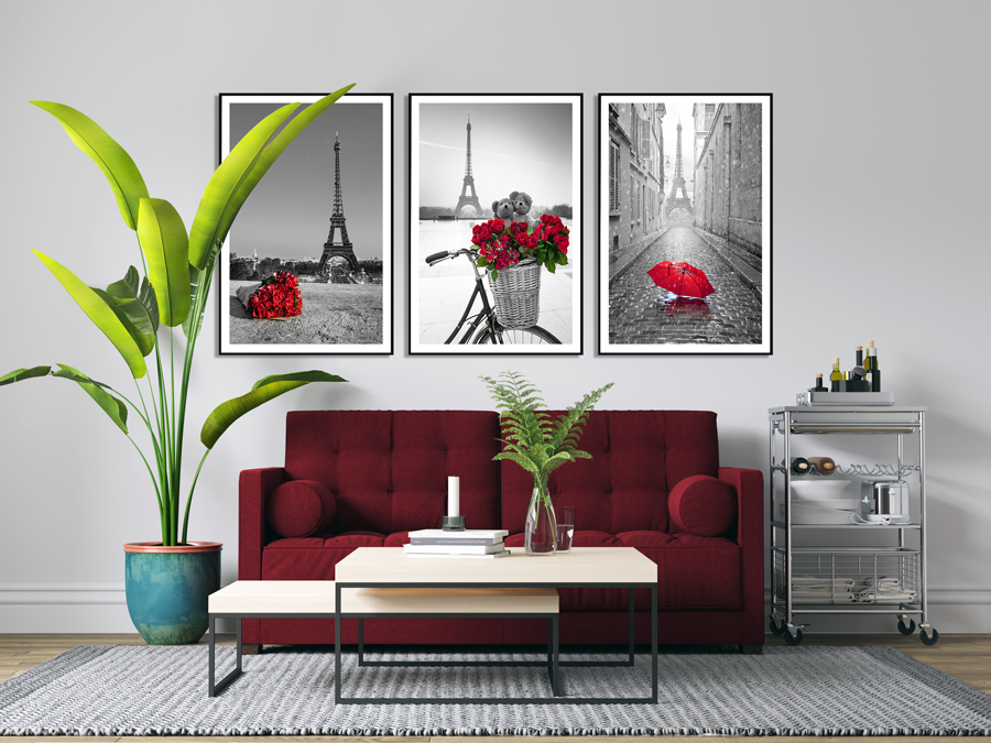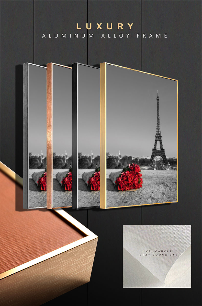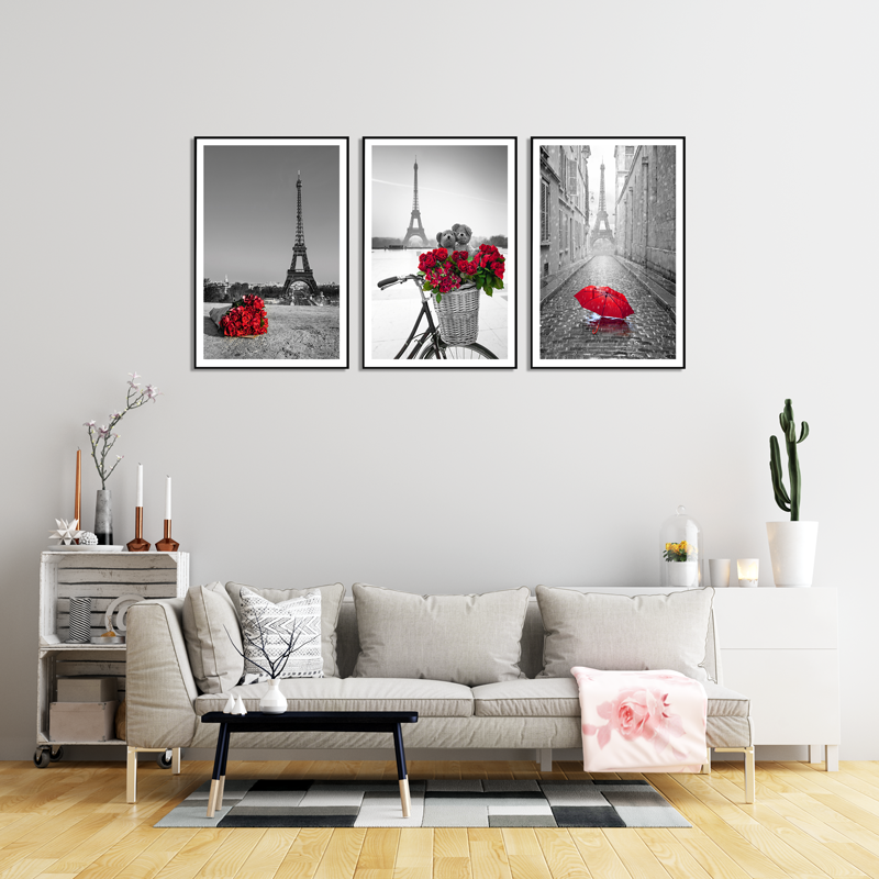 Giới thiệu Tranh treo tường Mica Khung nhôm 3 bức Tháp Eiffel và hoa hồng Hiện đại tại Tây Ninh