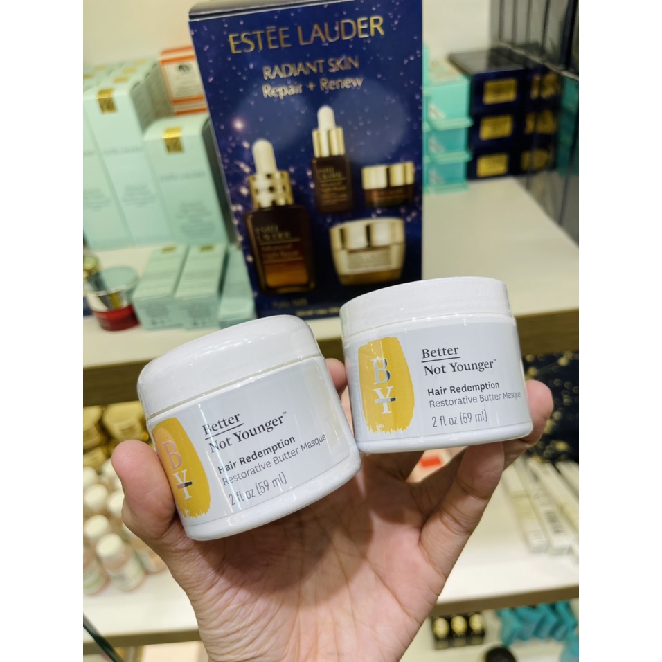 [TRAVELSIZE 59ML ] Mặt nạ tóc cao cấp BETTER NOT YOUNGER hair redemption butter masque _Em này lần trc nàng nào hụt thì về thêm đc ít nè ce _Mask ủ tóc highend Better not younger , siêu thơm siêu mềm tóc , dùng được cực lâu ạ _Thơm xỉu như nước hoa luôn, mềm tóc , ko silicone, vegan, paraben free, SLS free, cruety free _Thành phần em này với chiết xuất tinh dầu hạt dẻ , thịt quả xoài ,argan oil giúp phục hồi tóc chuyên sâu , làm mềm tóc và Caffein giúp chống lão hóa và kích thích mọc tóc nha . _Fullsize 35$ cho 200ml thui ạ , mua 4 e này tiết kiệm ngay hơn 500k so với bé Fullsize mà dung tích còn hơn em Fullsize nè Tp đẹp an toàn, bám mùi tóc lâu lun nhá . Hũ to lắm 59ml : 98k combo 3 hũ là 180ml: 240k ( hũ fullsize có 200ml hãng bán hơn 900k lận nha)