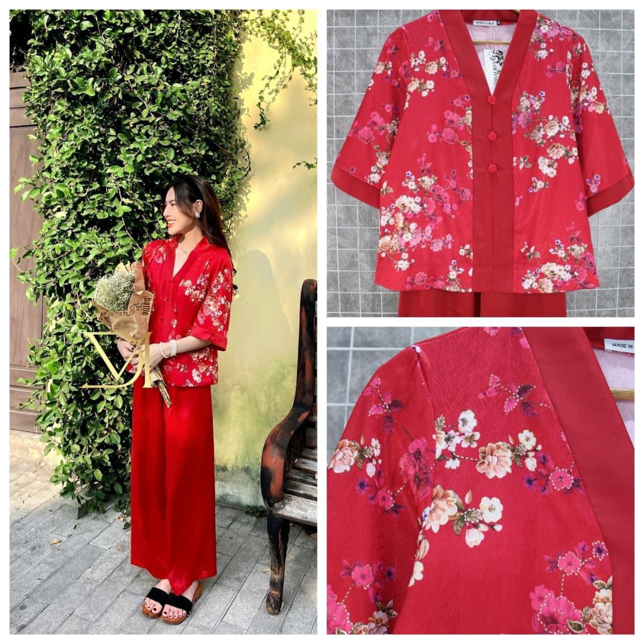 Đồ được thiết kế vải lụa vân gỗ phần thân áo họa tiết trang nhã kết hợp Lụa màu ở phần quần hài hòa.