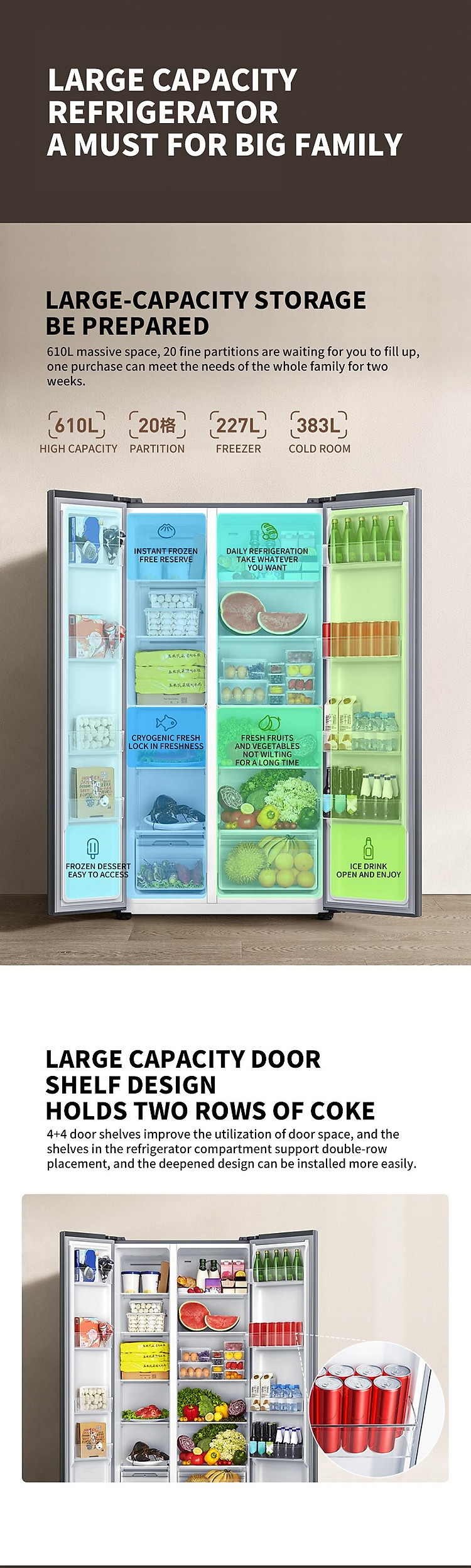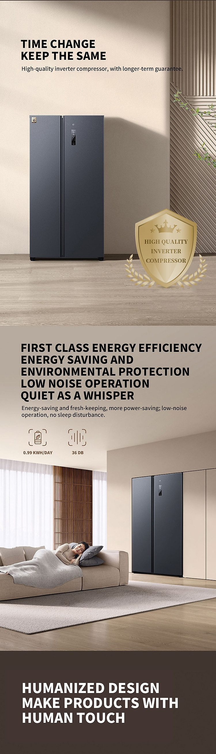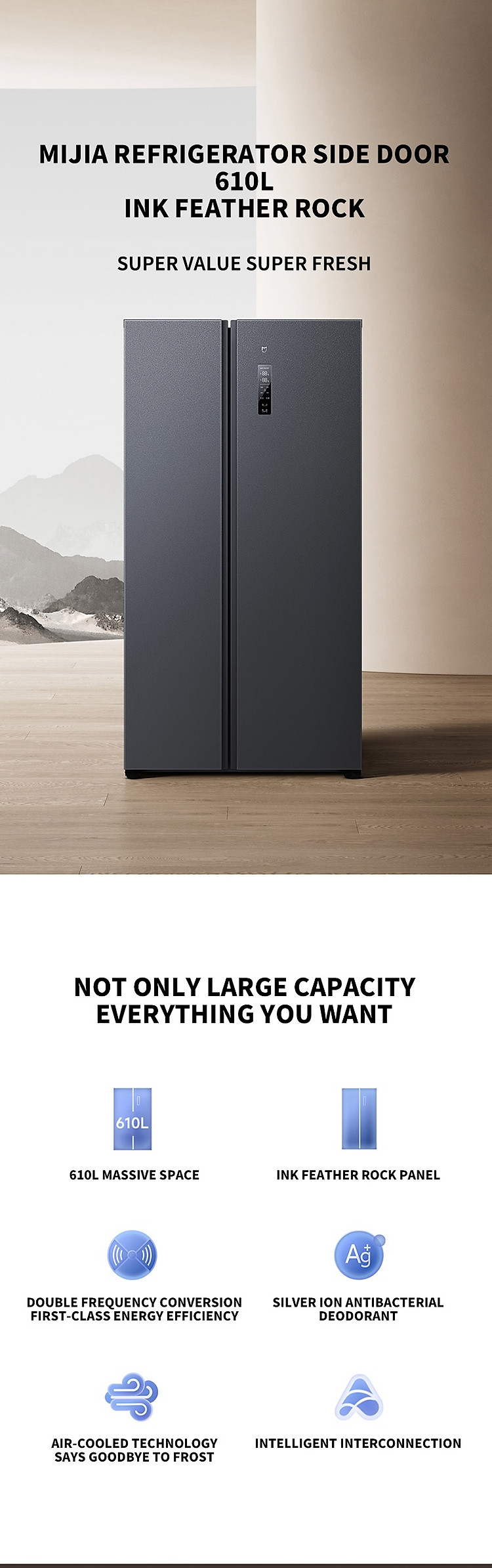 Tủ lạnh Mijia Side-by-side 610L, tủ lạnh này được thiết kế với hiệu suất năng lượng tần số kép bậc nhất là 0,99 kWh mỗi ngày, được làm mát bằng không khí mà không có sương giá và có chức năng kháng khuẩn bằng ion bạc để loại bỏ mọi mùi và luôn giữ vệ sinh.
