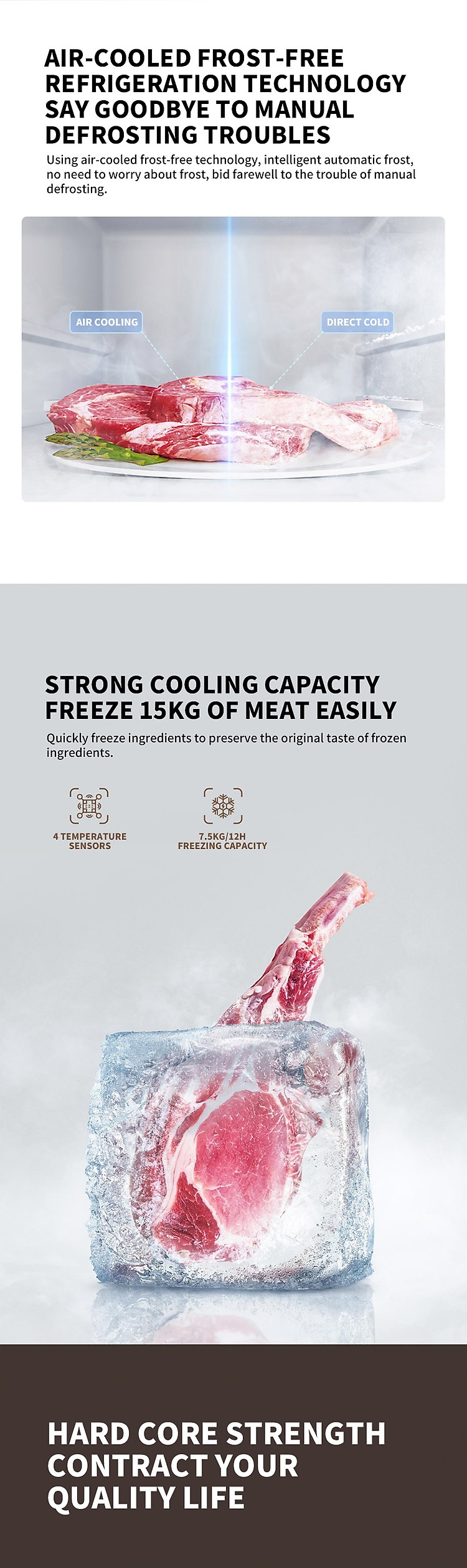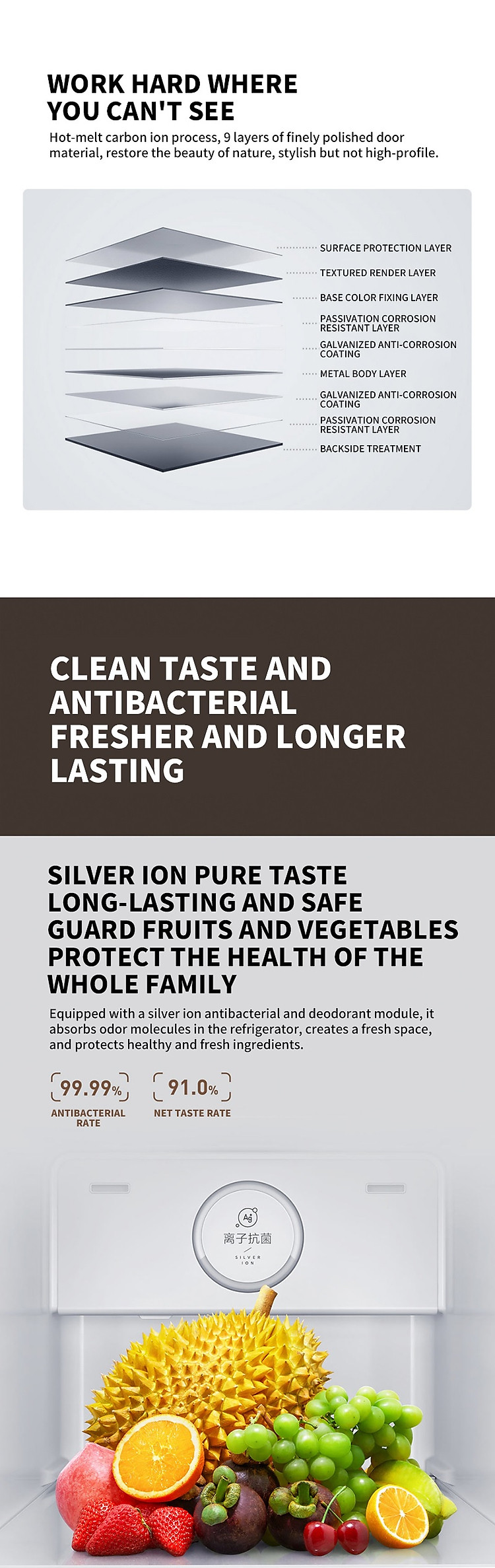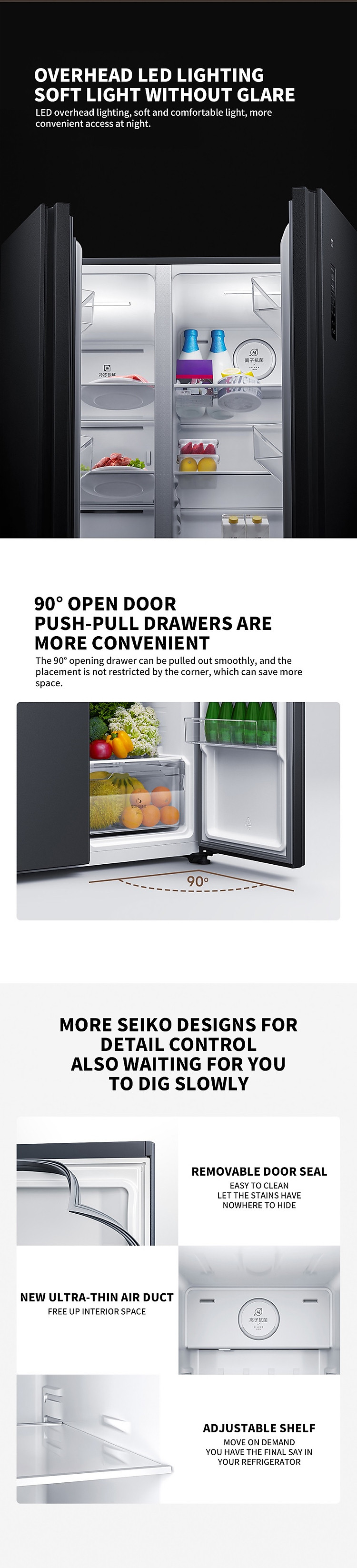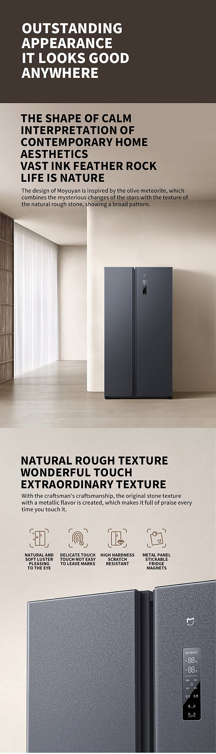 Tủ lạnh Mijia Side-by-side 610L, tủ lạnh này được thiết kế với hiệu suất năng lượng tần số kép bậc nhất là 0,99 kWh mỗi ngày, được làm mát bằng không khí mà không có sương giá và có chức năng kháng khuẩn bằng ion bạc để loại bỏ mọi mùi và luôn giữ vệ sinh.