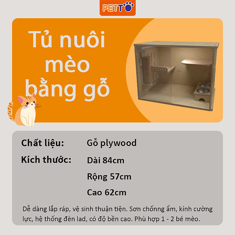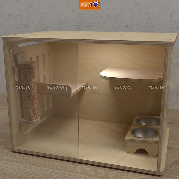 - Tủ cho mèo bằng gỗ có độ vững chắc giúp mèo yên tâm vận động sinh hoạt. Thiết kế khá rộng nên ban có thể thêm các dụng cụ cần thiết cho mèo như: nhà vệ sinh hay bát ăn đều vừa lại vô cùng tiện lợi...