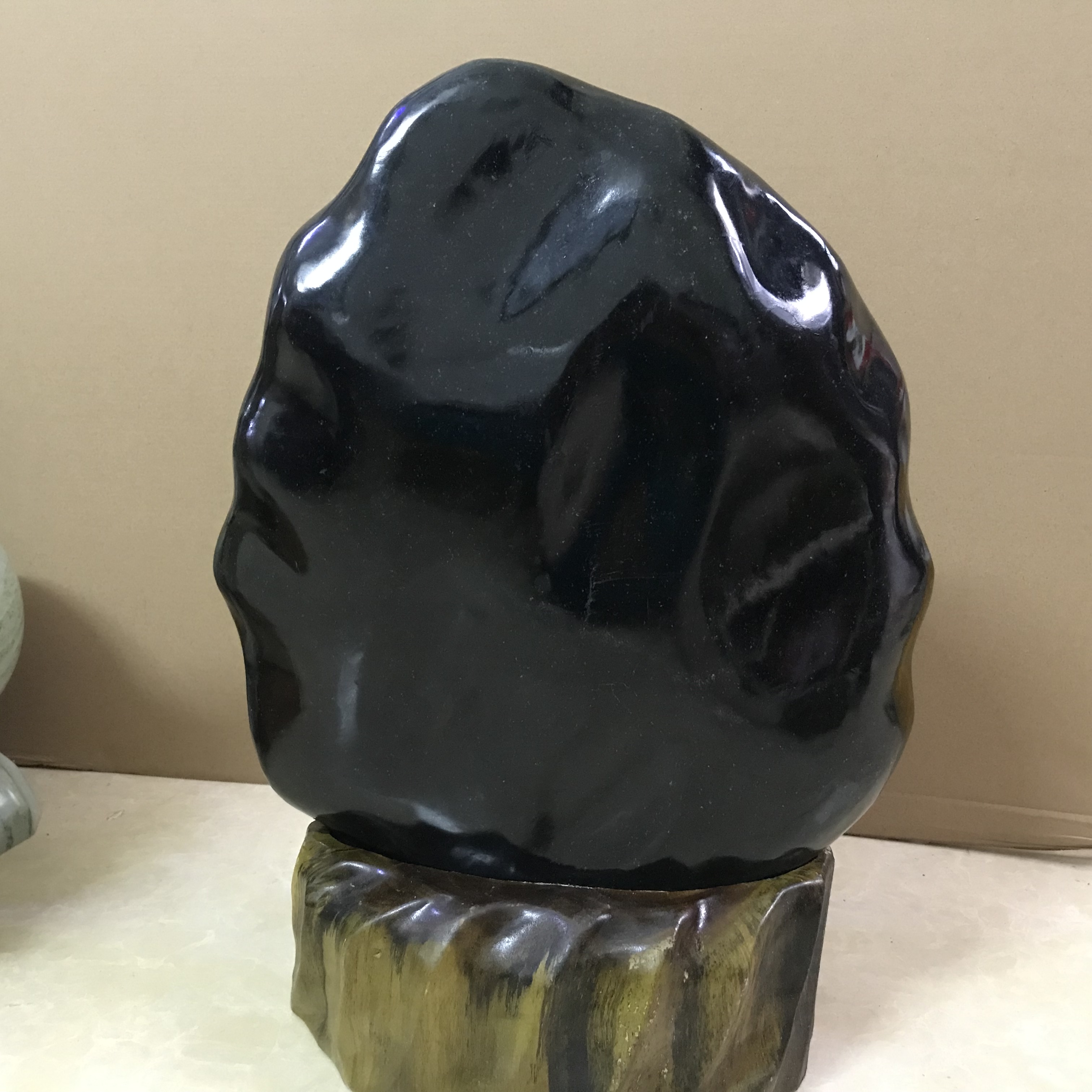 Giới thiệu Cây đá tự nhiên màu đen bóng cao 55 nặng 38 kg cả chân đế đá của Việt Nam cho người mệnh Mộc và Thủy