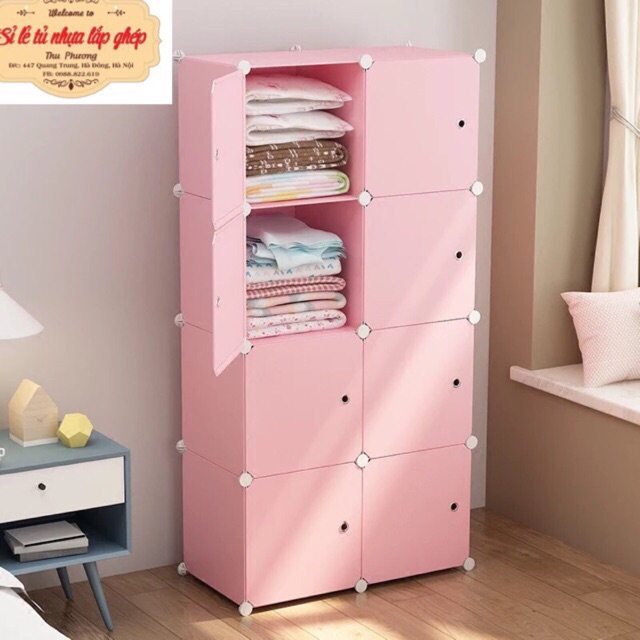 Chi tiết phụ kiện tủ nhựa ghép đa năng 8 ô. Tấm thân 35*45cm: 22 Tấm lưng 35*35 cm: 8 Cánh cửa 35*35 cm: 8 Chốt : 32 cái Nam châm : 16 cái Thanh treo : 1 cái Búa gỗ : 1 cái Giấy hướng dẫn lắp tủ : 1 tờ 🌵kích thước sau khi lắp tủ:150cm x 75cm x sâu 47cm ( cao x rộng x sâu ). ưu điểm của tủ nhựa ghép đa năng 8 ô : Chất liệu nhựa PP( Polypropylen) an toàn thân thiện với môi trường . Khoang để đồ bố trí linh hoạt tháo lắp dễ dàng Sức chứa lớn mỗi ô tủ chịu được trọng lượng 12kg Mẫu mã đa dạng phong phú, màu sắc tươi mới Đặc biệt khách hàng có thể tùy ý lựa trọn màu sắc,số ô và lựa trrọn cửa tủ như mong muốn. Chất liệu tủ nhựa ghép đa năng Tủ được làm từ tấm nhựa PP ( Polypropylen) an toàn với môi trường. Tấm nhựa có độ dày 0.3-0.4mm,xung quanh được gia cố bằng khung thép có sơn tĩnh điện, đường kính khung thép là 4mm. Các khung thép liên kết với nhau qua những chốt nhựa rất chắc chắn. Chốt nhựa làm từ ABS ( Acrylonitrile Butadiene Styrene copolymers)vô cùng dẻo dai và bền bỉ. Thanh treo được làm bằng thép và được sơn tĩnh điện. Nam châm được gắn vào vị trí mép cửa tủ để làm nhiệm vụ giữ cánh tủ nhà bạn không bị hở khi đóng lại.