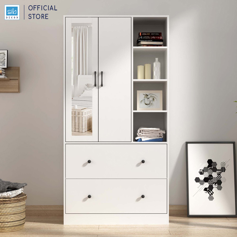 - Có 2 ngăn kéo rộng rãi ở phía dưới, tủ quần áo có 4 ngăn mở và tủ lớn cung cấp không gian tiện dụng để cất giữ đồ gia dụng, thanh treo quần áo sẵn sàng để treo áo khoác, vest và áo sơ mi.