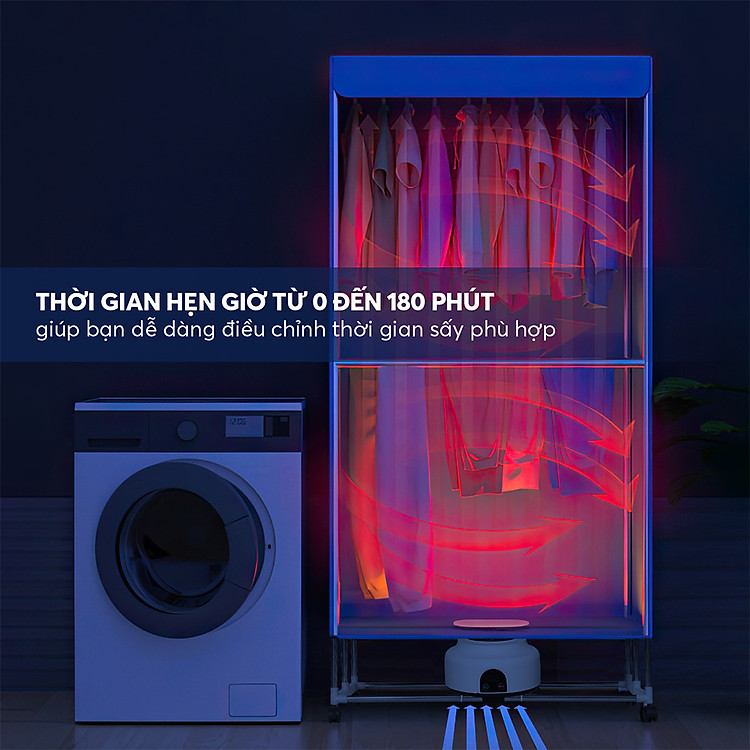 Khả năng chịu tải 30kg: Tủ sấy có khả năng chịu tải lên đến 30kg, giúp bạn sấy được một lượng lớn quần áo trong một lần, tiết kiệm thời gian và công sức.