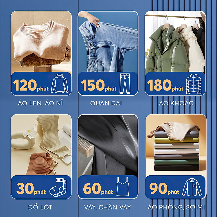 Thời gian hẹn giờ từ 0 đến 180 phút: Tủ sấy có chức năng hẹn giờ linh hoạt từ 0 đến 180 phút, giúp bạn dễ dàng điều chỉnh thời gian sấy phù hợp với từng loại quần áo và nhu cầu sử dụng.