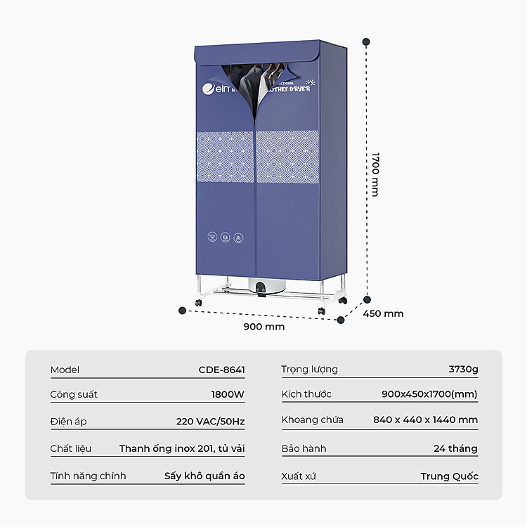 Kích thước rộng rãi: Tủ sấy có kích thước tổng thể 900x450x1700mm và khoang chứa rộng 900x450x1440mm, cung cấp không gian đủ lớn để sấy nhiều quần áo cùng lúc, phù hợp cho gia đình có nhiều thành viên.