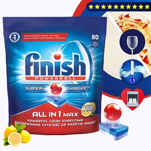 - Viên rửa chén Finish All In 1 Max Dishwasher Tablets Lemon dạng nén hoạt động tự động trợ giúp quá trình rửa tổng hợp, đảm bảo độ sáng bóng nguyên bản trên thủy tinh, tách bộ chén đĩa khỏi vết bẩn siêu việt.
