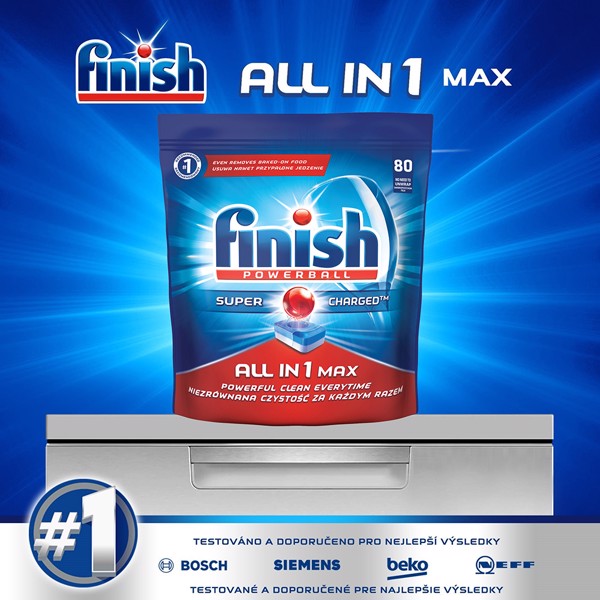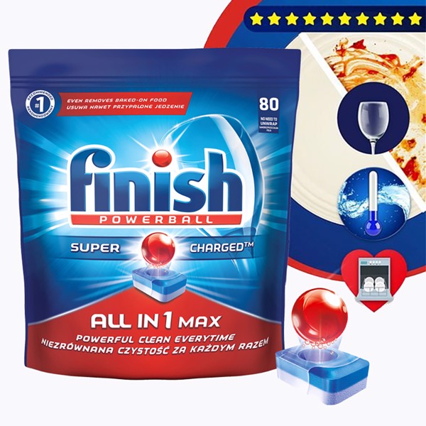 - Viên rửa chén Finish All In 1 Max Dishwasher Tablets dạng nén hoạt động tự động trợ giúp quá trình rửa tổng hợp, đảm bảo độ sáng bóng nguyên bản trên thủy tinh, tách bộ chén đĩa khỏi vết bẩn siêu việt.