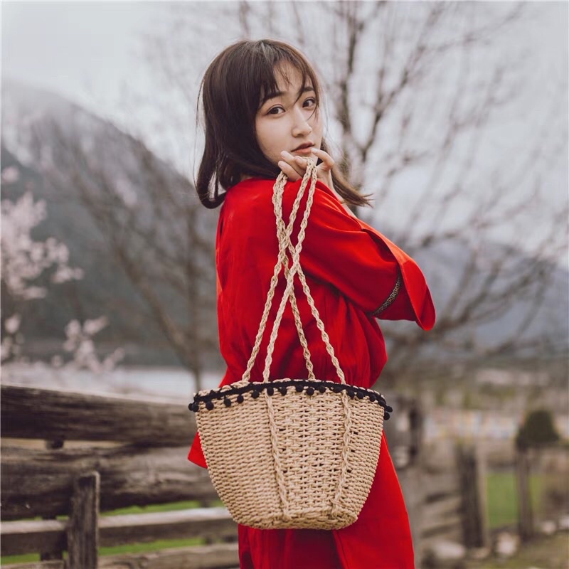 Túi Ví Nữ > Túi đeo chéo & Túi đeo vai || Túi Cói Tua Rua Đính PomPom