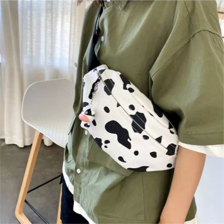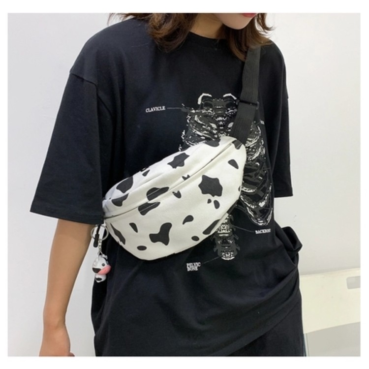 Giới thiệu Túi đeo chéo bao tử vải canvas thơi trang in hoạ tiết bò sữa