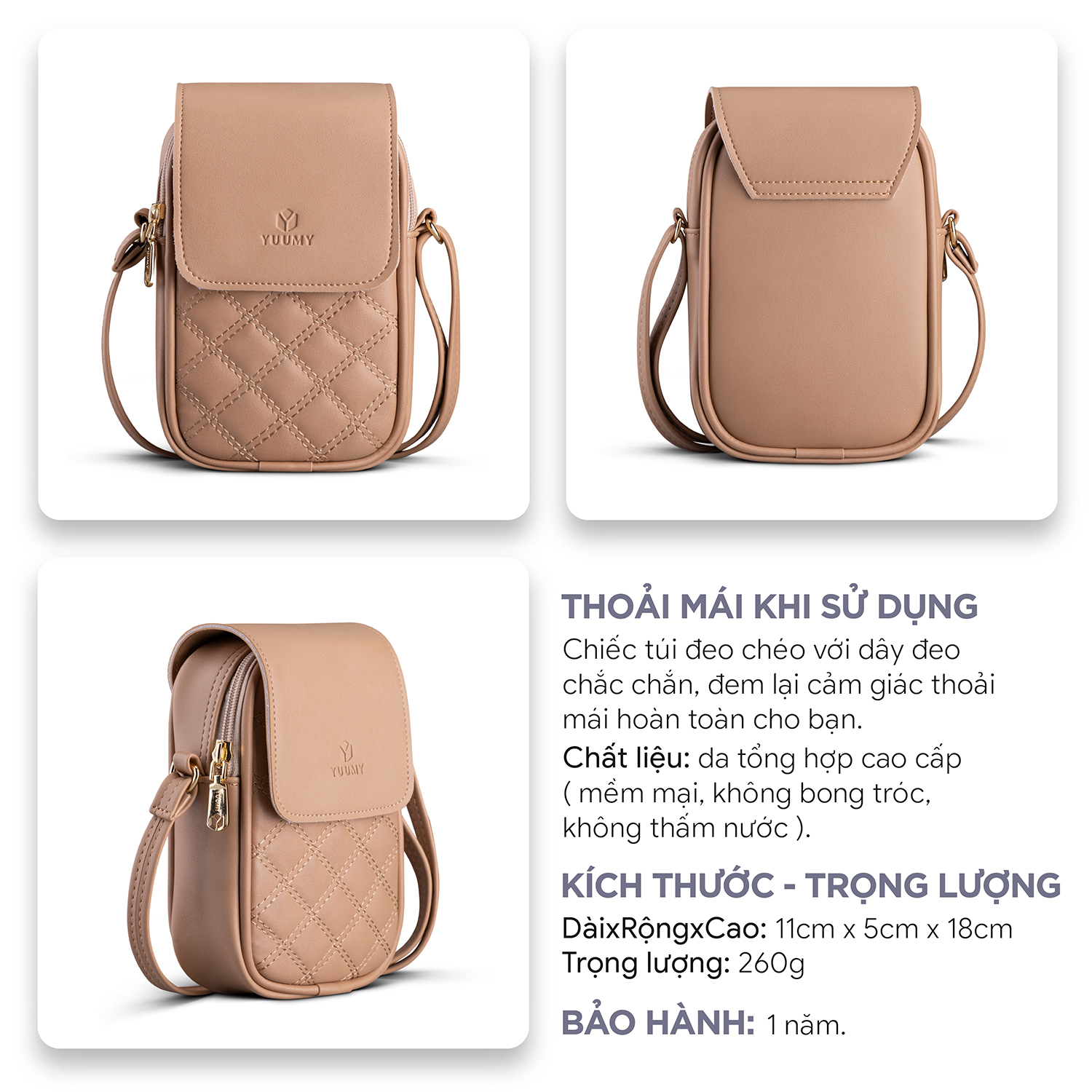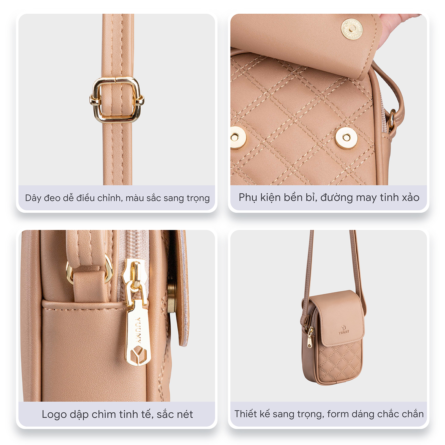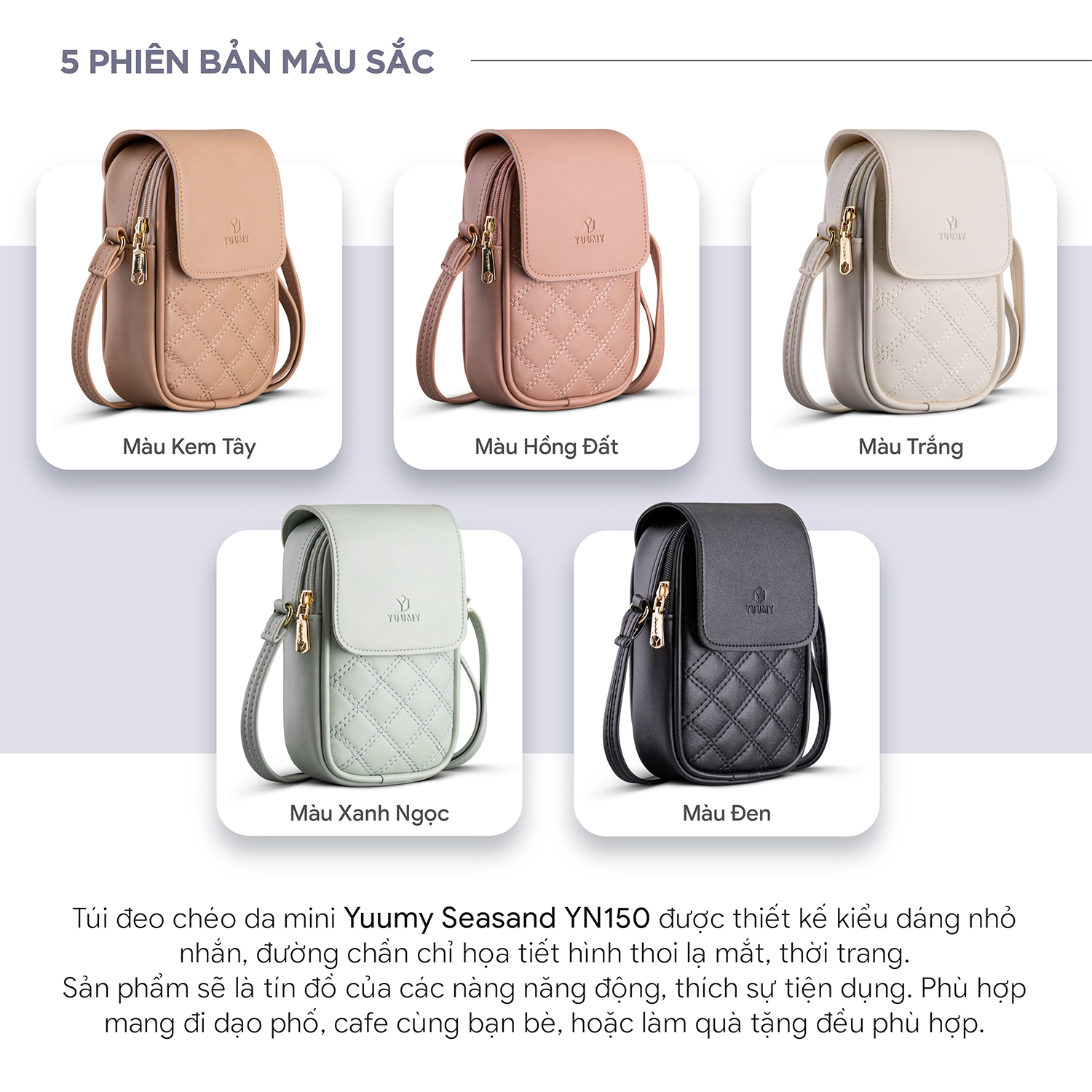 Túi đeo chéo da nữ mini Yuumy Seasand YN150 được thiết kế kiểu dáng nhỏ nhắn, đường chần chỉ họa tiết hình thoi lạ mắt, thời trang. Sản phẩm sẽ là tín đồ của các nàng năng động, thích sự tiện dụng. Bên trong của chiếc túi đựng vừa đủ điện thoại, tiền, thẻ,đầy đủ hành trang để nàng ra đường nhưng vẫn đẹp. Phù hợp mang đi dạo phố, cafe cùng bạn bè, hoặc làm quà tặng đều phù hợp.