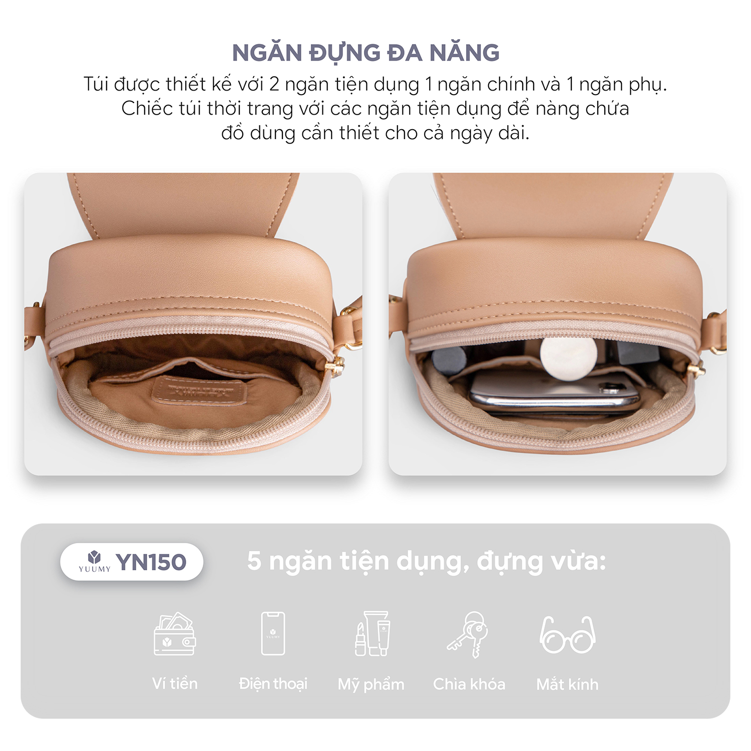 - Công dụng: Đựng tiền, điện thoại, son, phấn, chìa khóa, mắt kính,