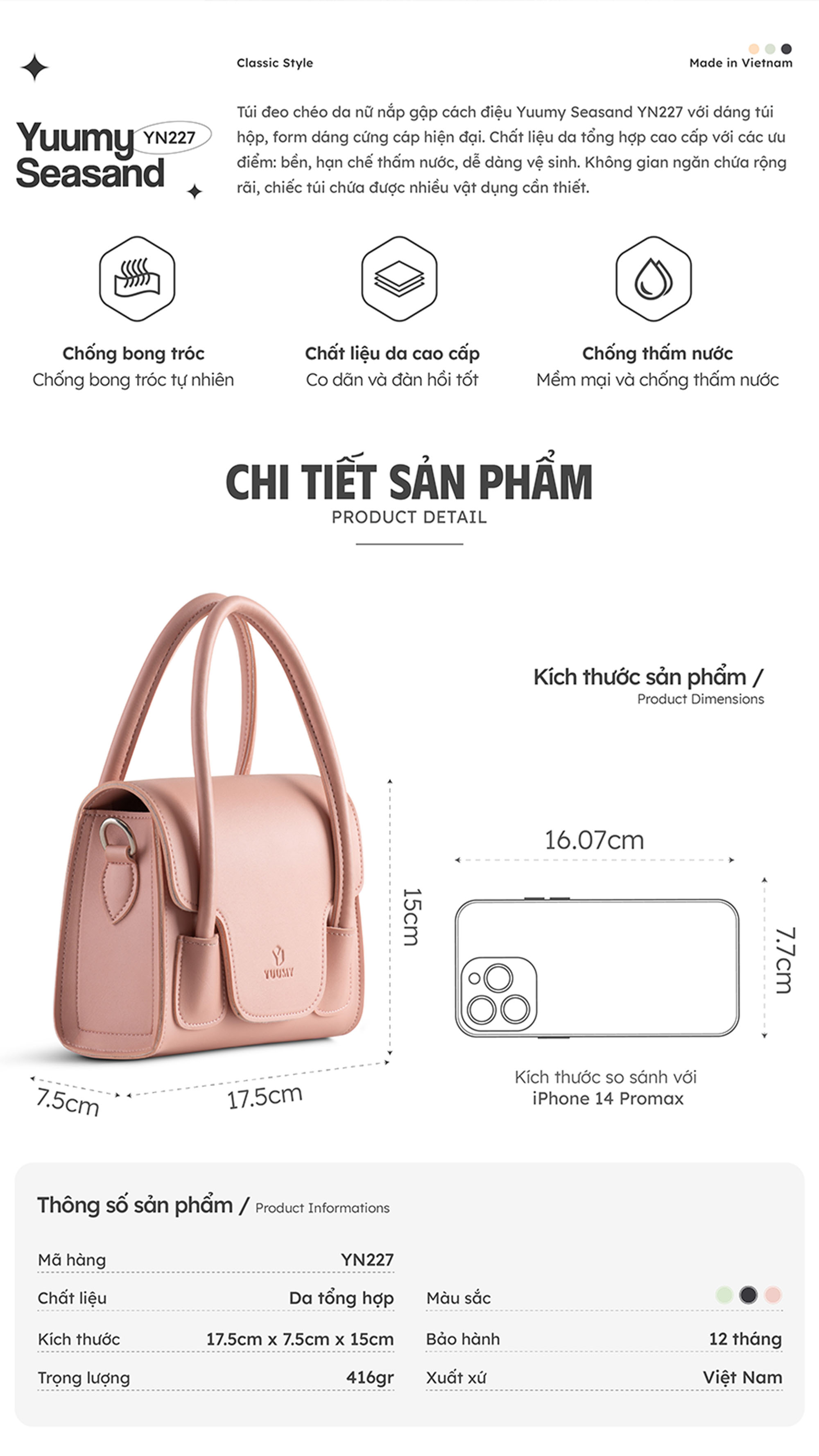 Túi đeo chéo da nữ nắp gập cách điệu Yuumy Seasand YN227 với dáng túi hộp, form dáng cứng cáp hiện đại. Chất liệu da tổng hợp cao cấp với các ưu điểm: bền, hạn chế thấm nước, dễ dàng vệ sinh. Không gian ngăn chứa rộng rãi, chiếc túi chứa được nhiều vật dụng cần thiết của bạn như: điện thoại, chìa khóa, ví, son môi… Sản phẩm có cả quai cầm gắn liền và dây đeo tháo rời để dễ dàng tùy chỉnh kiểu đeo. Với các lựa chọn màu sắc thời trang, bắt mắt, chiếc túi sẽ là phụ kiện thời trang không thể thiếu của các cô nàng năng động.