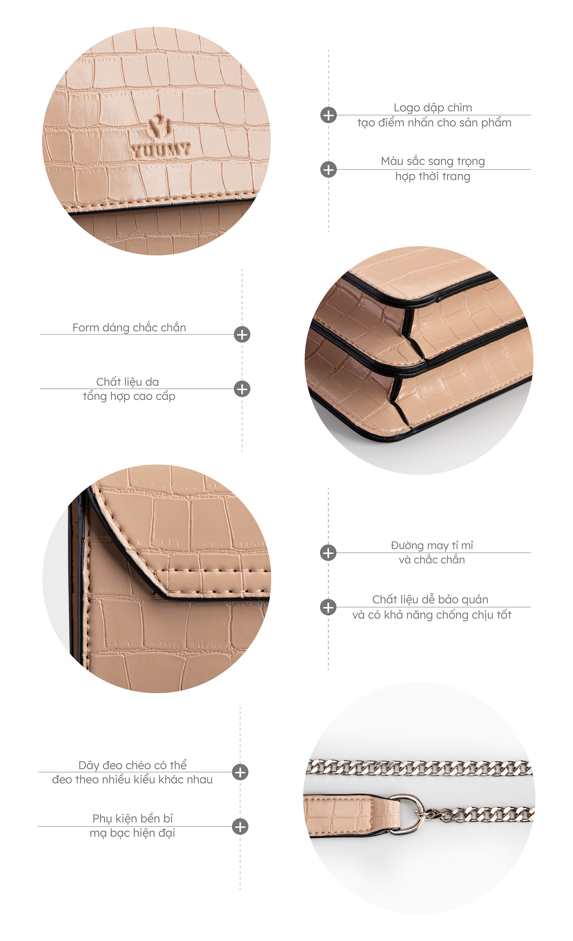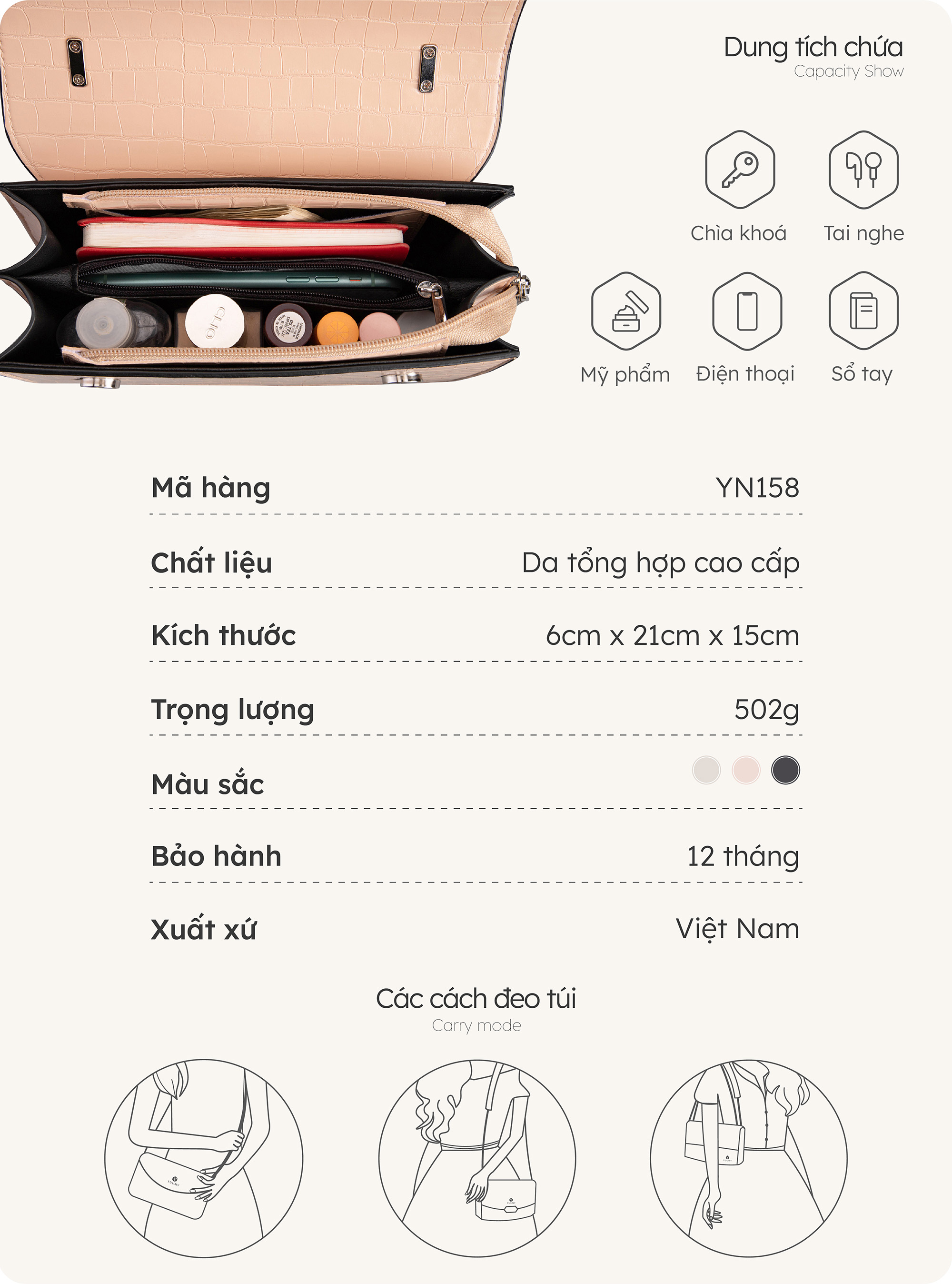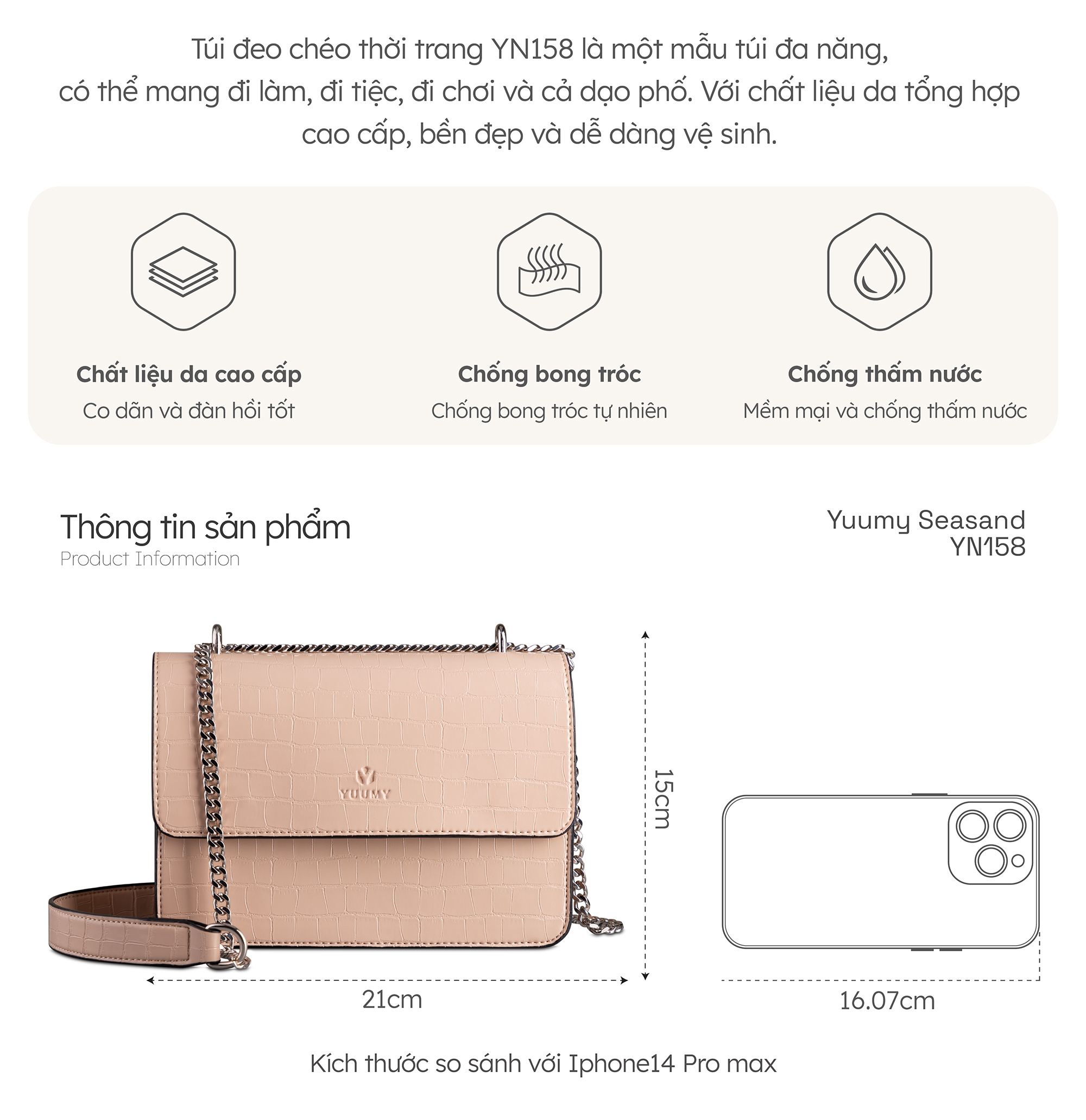 Túi đeo chéo thời trang YN158 là một mẫu túi đa năng, có thể mang đi làm, đi tiệc, đi chơi và cả dạo phố. Với chất liệu da tổng hợp không bong tróc, chống thấm nước tốt, bền đẹp và dễ dàng vệ sinh. Phom túi hộp cứng cáp giúp túi hạn chế bị cong vênh, nhăn gãy trong quá trình sử dụng. Thiết kế túi không quá cầu kỳ, có thể kết hợp với nhiều trang phục khác nhau, là một món phụ kiện không thể thiếu dành cho các nàng theo phong cách nữ tính và hiện đại.