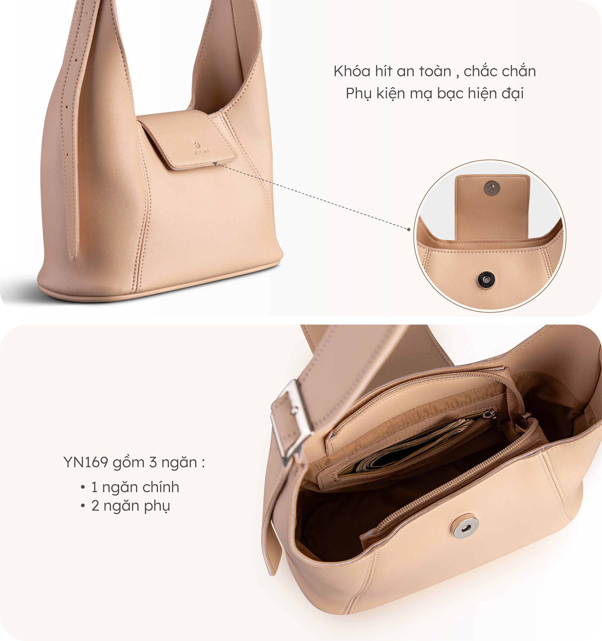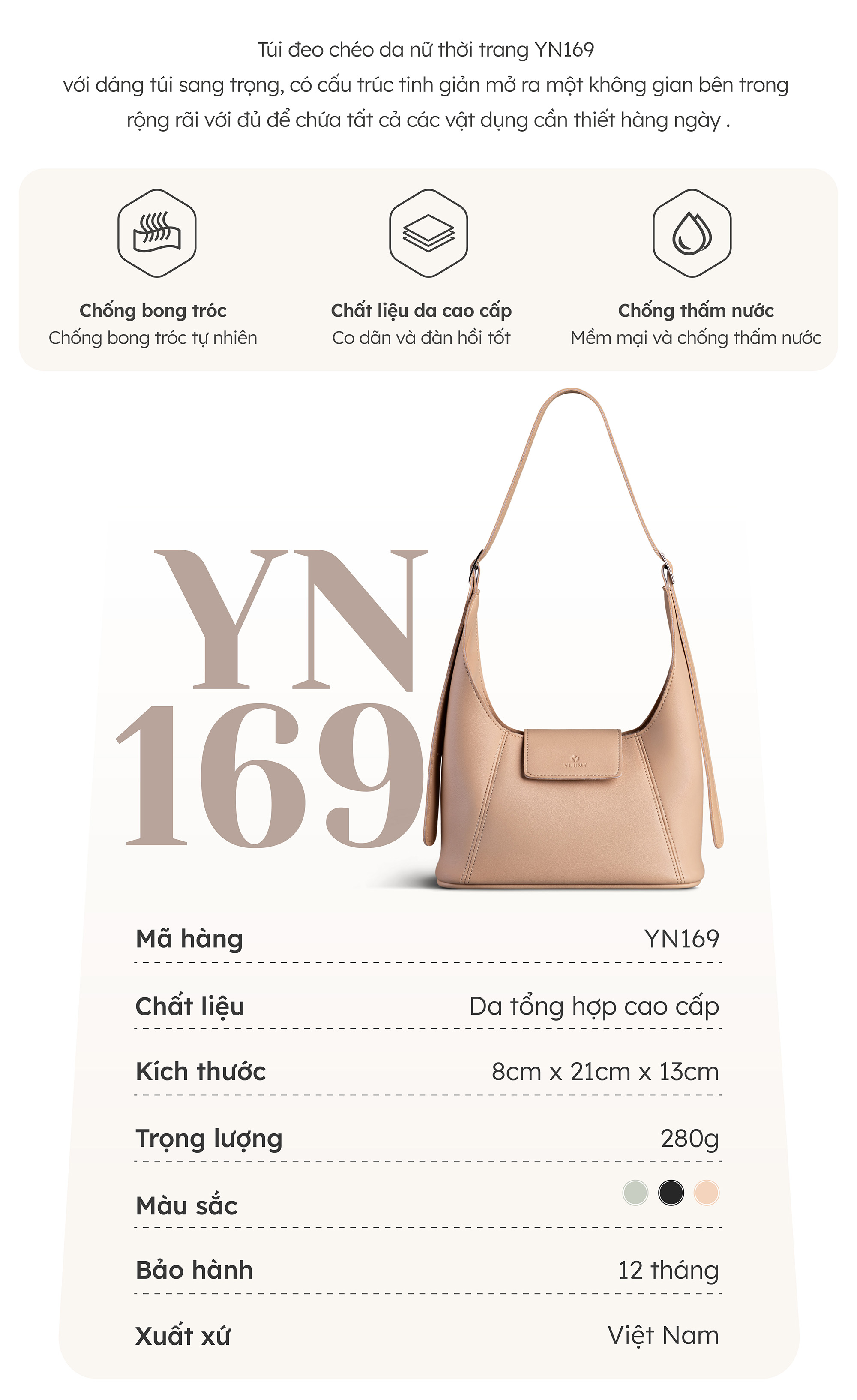 Túi đeo chéo da nữ thời trang YN169 với dáng túi sang trọng, có cấu trúc tinh giản mở ra một không gian bên trong rộng rãi với đủ để chứa tất cả các vật dụng cần thiết hàng ngày của bạn như điện thoại, ví tiền, chìa khóa, mỹ phẩ Phần dây đeo có thể tăng giảm linh hoạt để bạn đeo vai hay đeo chéo tùy sở thích. YN169 sở hữu các gam màu hiện đại, trẻ trung, dễ kết hợp với nhiều trang phục thời trang sành điệu.