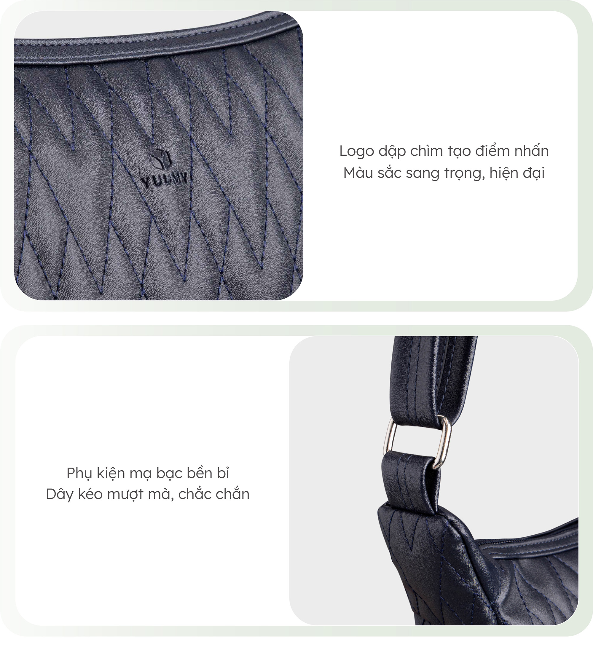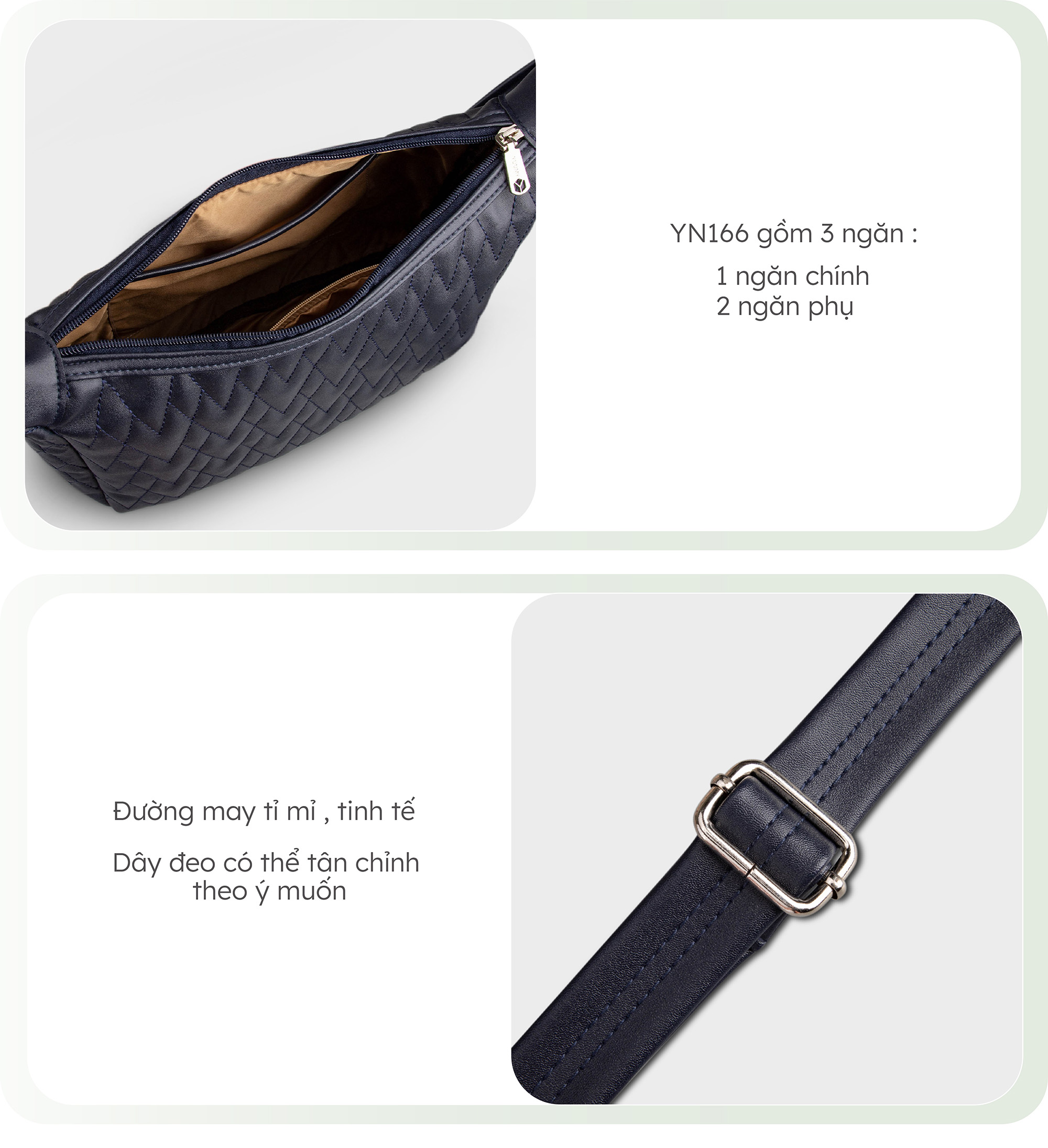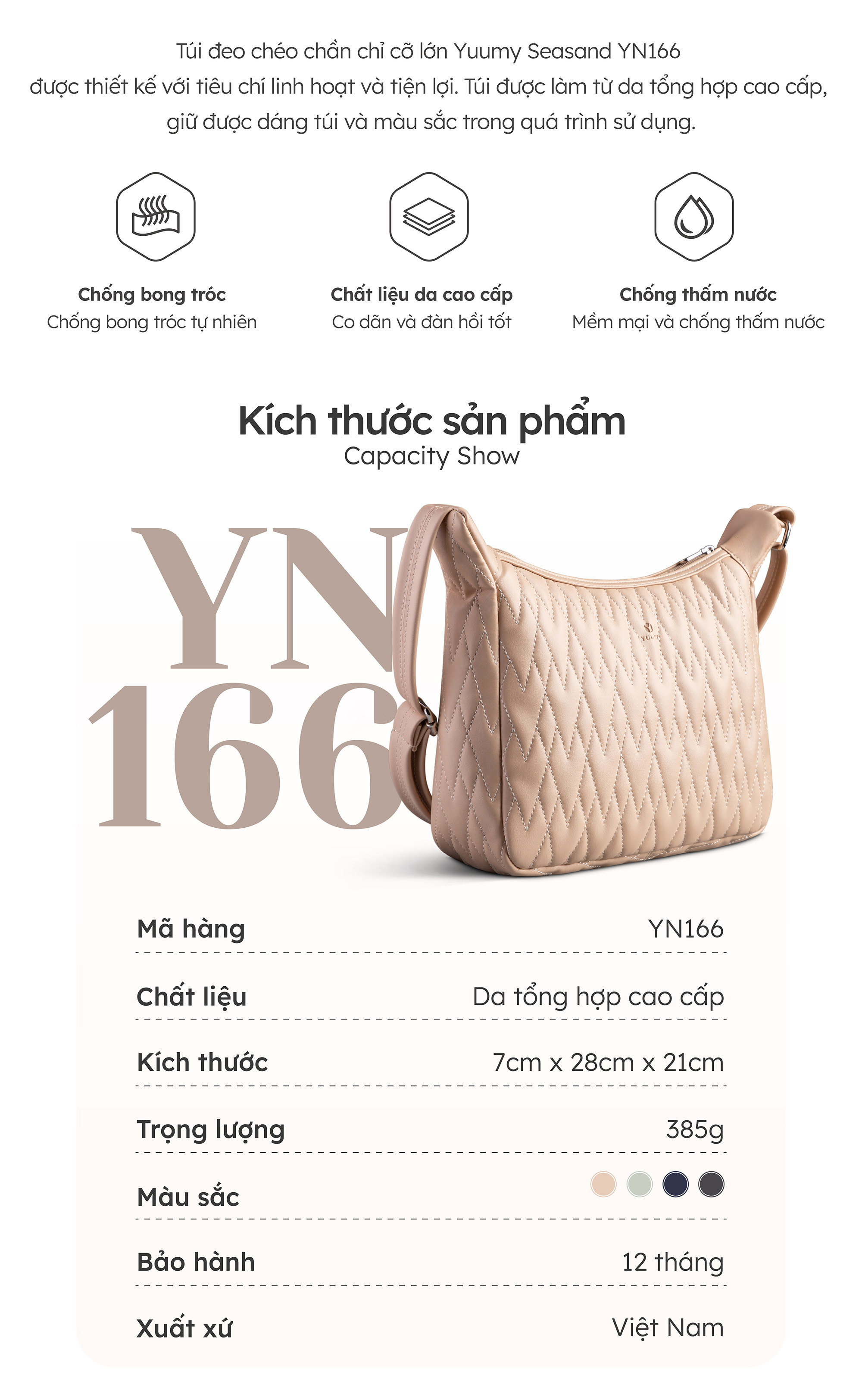 Túi đeo chéo chần chỉ cỡ lớn Yuumy Seasand YN166 được thiết kế với tiêu chí linh hoạt và tiện lợi. Túi được làm từ da tổng hợp cao cấp, giữ được dáng túi và màu sắc trong quá trình sử dụng. Túi có khóa kéo để giữ đồ đạc của bạn an toàn, không bị rơi ra ngoài. Dây đeo mềm, có thể điều chỉnh được, không gây cảm giác khó chịu khi đeo trong thời gian dài. Sản phẩm có thể sử dụng hằng ngày, khi đi làm, đi mua sắm hoặc đi du lịch.