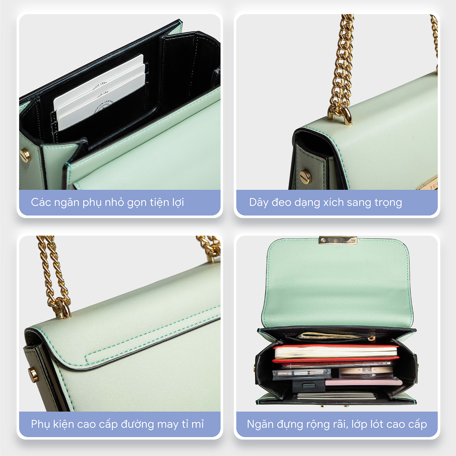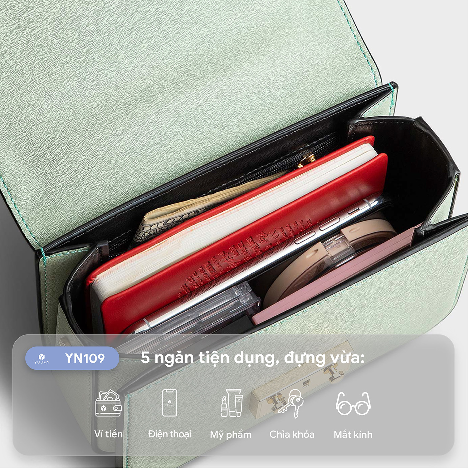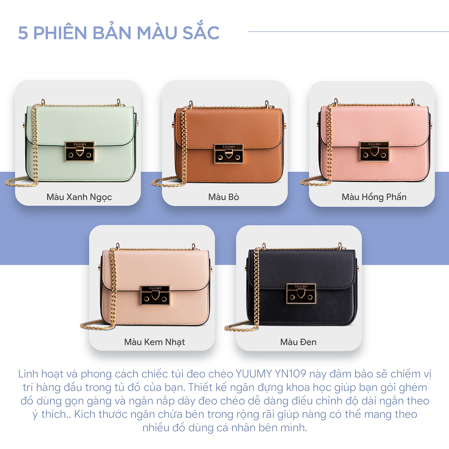 Sang trọng và nhỏ gọn, chiếc túi cỡ nhỏ YUUMY YN109 xa hoa này được làm nổi bật với phần khóa nhấn kim loại tông vàng trên nền da mịn màng cao cấp. Dây đeo dạng xích tạo nên sự tương phản trực quan đẹp mắt cho vẻ ngoài của bạn. Điểm thưởng của chiếc túi này là tuy nhỏ nhắn nhưng vẫn đủ sức chứa tiền, thẻ card và các đồ dùng cá nhân của bạn một cách ngăn nắp. Hãy tạo kiểu với một chiếc đầm xẻ vai cùng đôi cao gót ở bữa tiệc để có một diện mạo sang trọng.