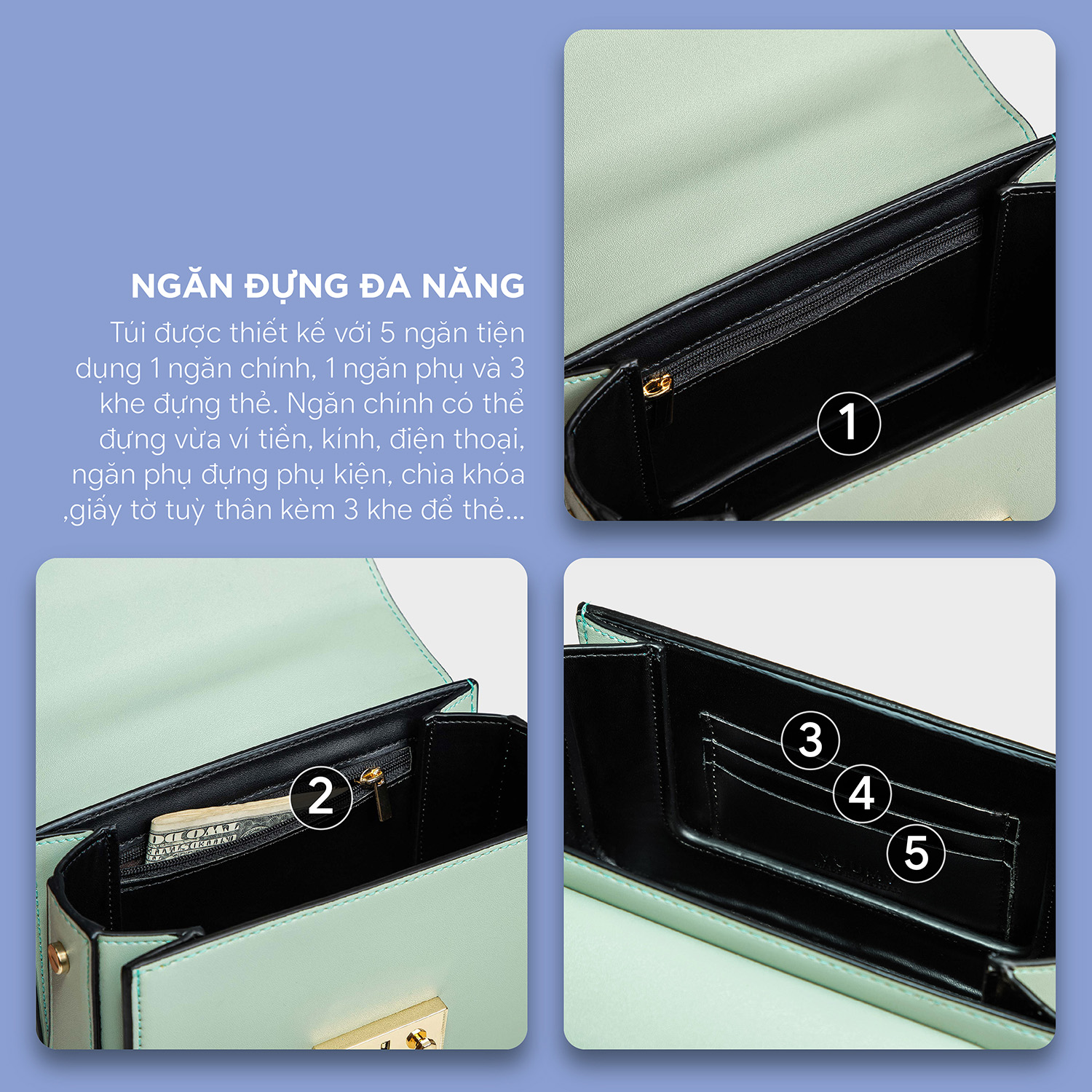 - Số ngăn: 5 ( 1 ngăn chính, 1 ngăn phụ, 3 khe thẻ )