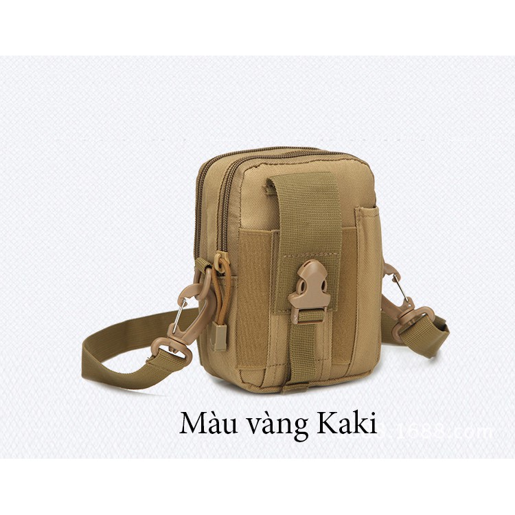 Túi có đây đeo chéo có thể để đồ cá nhân tiện đem theo. Mặt sau túi có dây để gép với balo hoặc túi khác, hoặc có thể gắn vô dây nịt (thắt lưng). Kích thước: 17cm*12*9cm. Có thể để vừa điện thoại. Bên trong có 2 ngăn chính chứa đồ. Màu sắc: vàng kaki, đen và đen sa mạc.