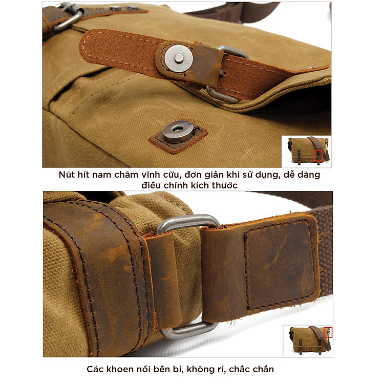 = Sản phẩm được làm từ chất liệu vải bố sáp chống nước, bền bỉ. Đồng thời, thiết kế phối da bò sáp cao cấp tạo nên nét đẹp cổ điển cho tổng thể sản phẩm.