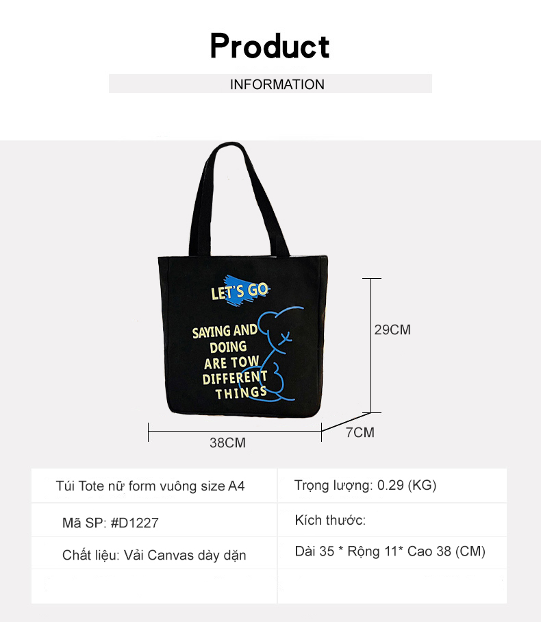 Túi tote vải canvas cao cấp nữ size lớn form vuông túi vải dày không nhăn có khóa kéo D1227