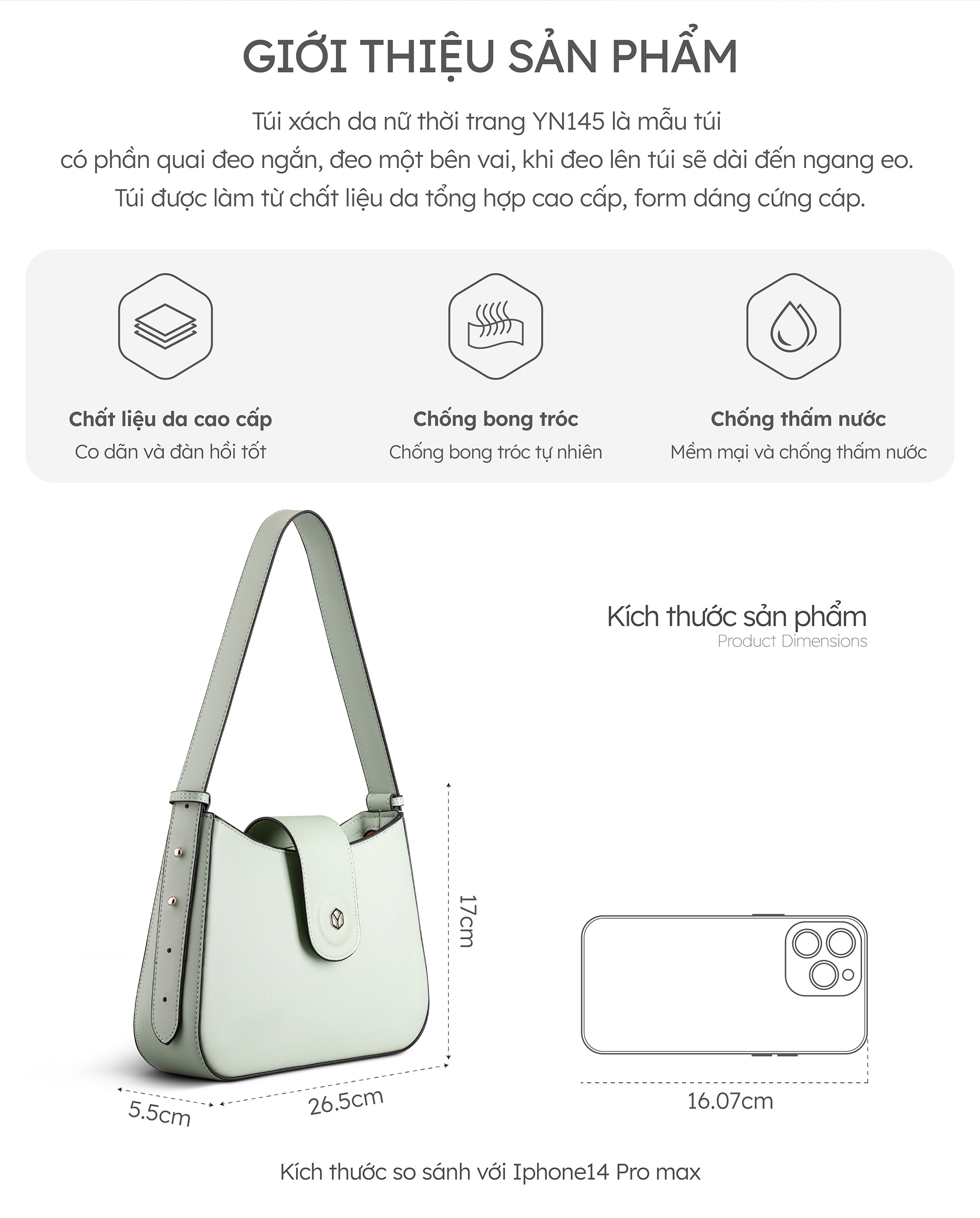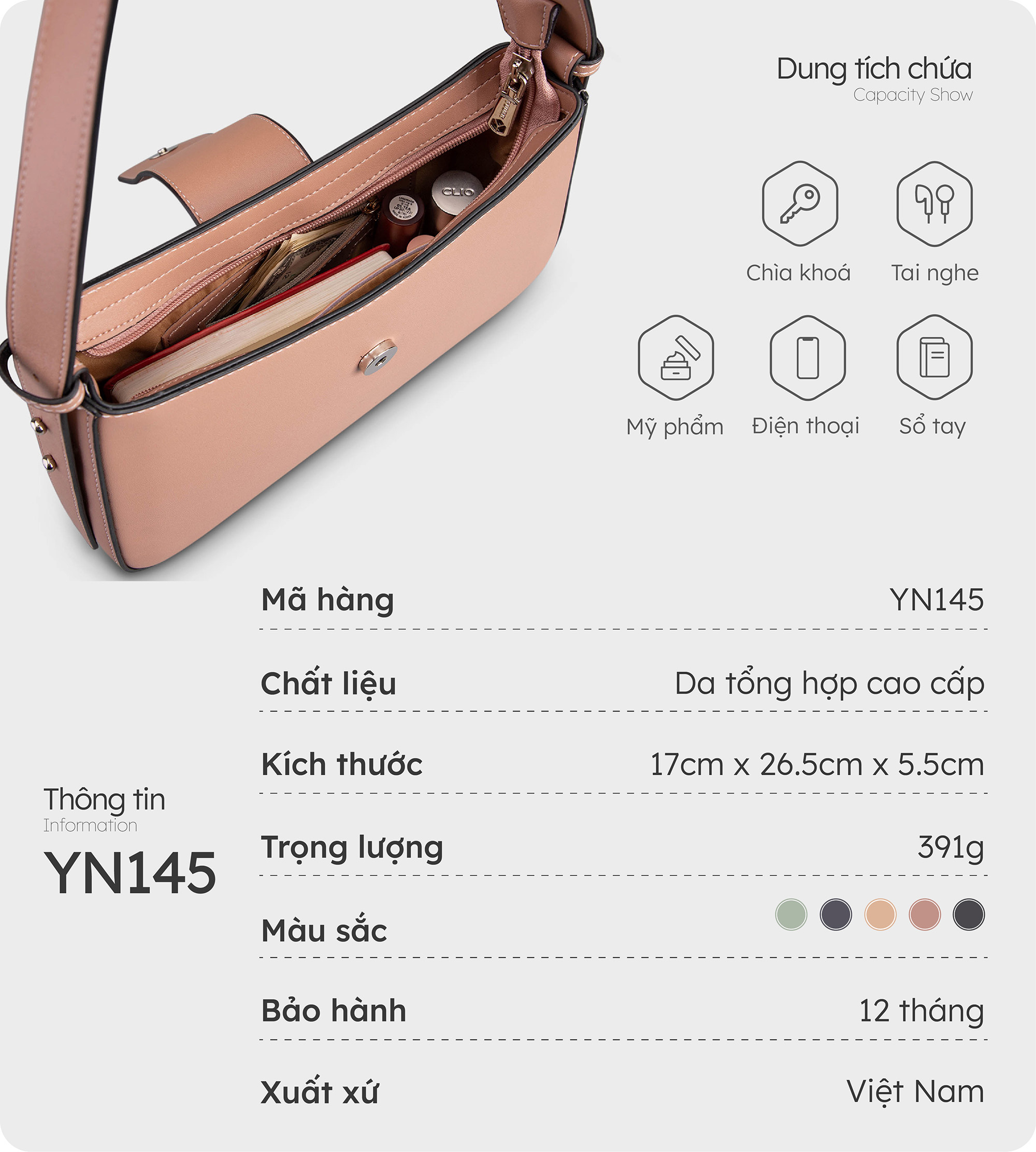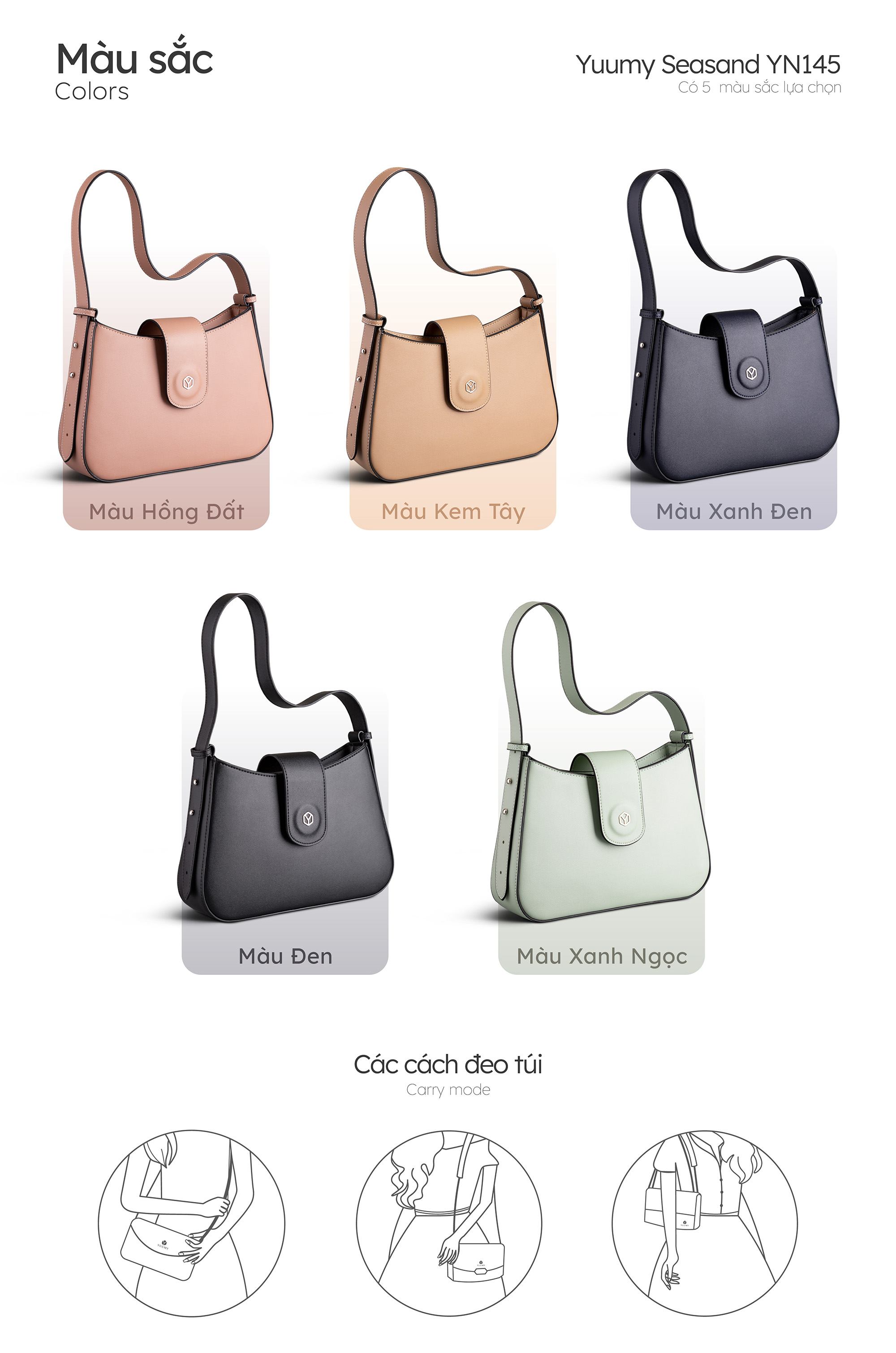 Túi đeo thời trang YN145 là mẫu túi có phần quai đeo ngắn, đeo một bên vai, khi đeo lên túi sẽ dài đến ngang eo. Túi được làm từ chất liệu da tổng hợp cao cấp, form dáng cứng cáp, bền đẹp trong suốt quá trình sử dụng. Bên cạnh thiết kế dáng cong tinh tế, mẫu túi này vừa có những màu sắc cá tính như đen, xanh đen; vừa có cả những gam màu pastel ngọt ngào. Bạn có thể thỏa sức phối với nhiều kiểu trang phục từ năng động, hiện đại đến nữ tính, quyến rũ.