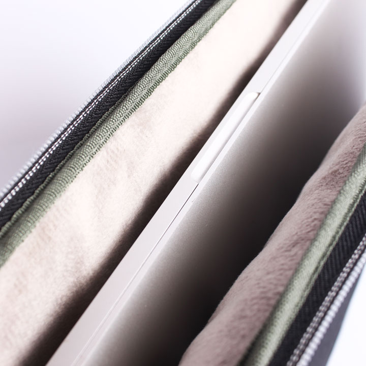 - Mặt tiếp xúc với laptop là lớp lông rất êm và mịn giảm trầy xước dù là ma sát nhỏ nhất. Kế đến chống sốc chính là lớp mút Pe dày khoảng 15mm để chống va đập.
