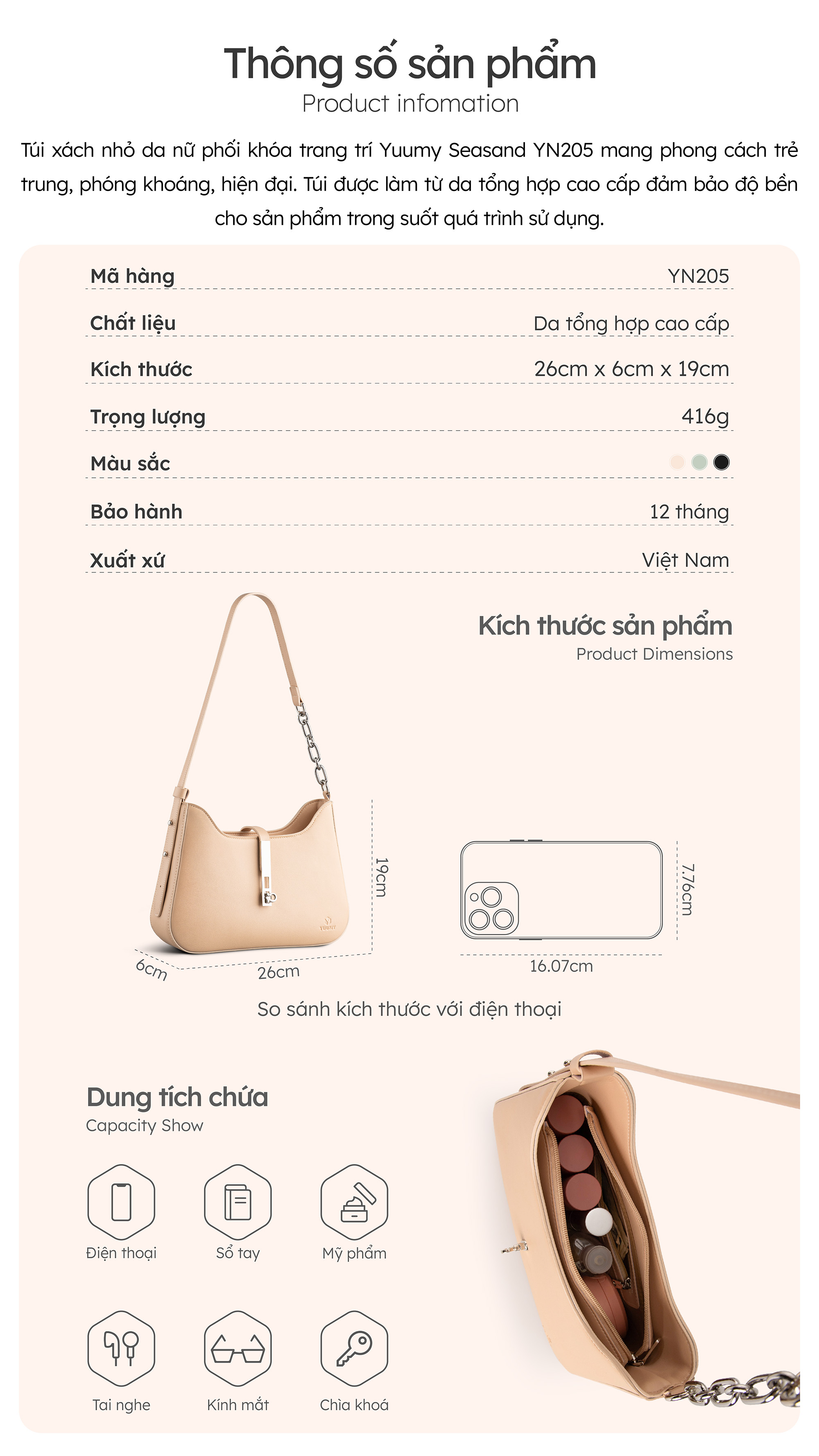Túi xách nhỏ da nữ phối khóa trang trí Yuumy Seasand YN205 mang phong cách trẻ trung, phóng khoáng, hiện đại. Túi được làm từ da tổng hợp cao cấp đảm bảo độ bền cho sản phẩm trong suốt quá trình sử dụng. Mặt ngoài của túi được tô điểm bằng chiếc khóa kim loại mạ vàng sang trọng. Bên trong túi rộng rãi, đựng được nhiều đồ dùng cá nhân nhỏ như ví tiền, điện thoại, chìa khóa, son… Túi có trọng lượng nhẹ, vô cùng thoải mái, dễ chịu dù đeo trong thời gian dài. Từ kiểu dáng đến màu sắc của sản phẩm đều dễ dàng kết hợp với nhiều kiểu trang phục, phù hợp sử dụng khi đi làm, đi chơi, dự tiệc