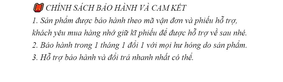 1. Sản phẩm được bảo hành theo mã vận đơn và phiếu hỗ trợ, khách yêu mua hàng nhớ giữ kĩ phiếu để được hỗ trợ về sau nhé.