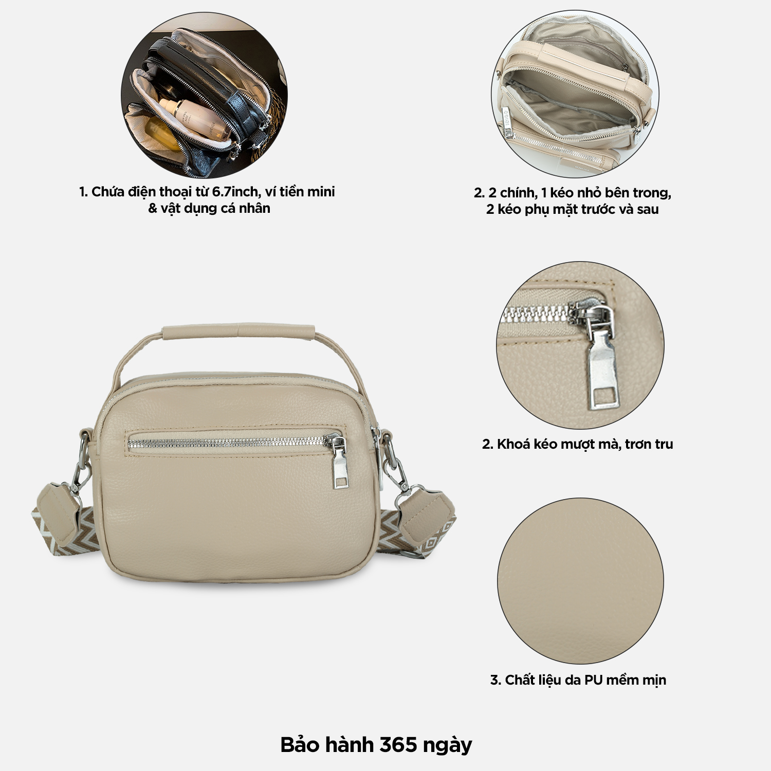 Túi có 2 ngăn chính để được điện thoại từ 6.7inch trở xuống, sạc dự phòng, mỹ phẩm. Ngoài ra bên trong có 1 ngăn phụ nhỏ để được giấy tờ tuỳ thân. Mặt trước túi có 1 ngăn kéo phụ thích hợp để tai nghe, khăn giấy. Cùng 1 ngăn kéo phụ mặt sau để được chìa khoá, thẻ xe tiện dụng.