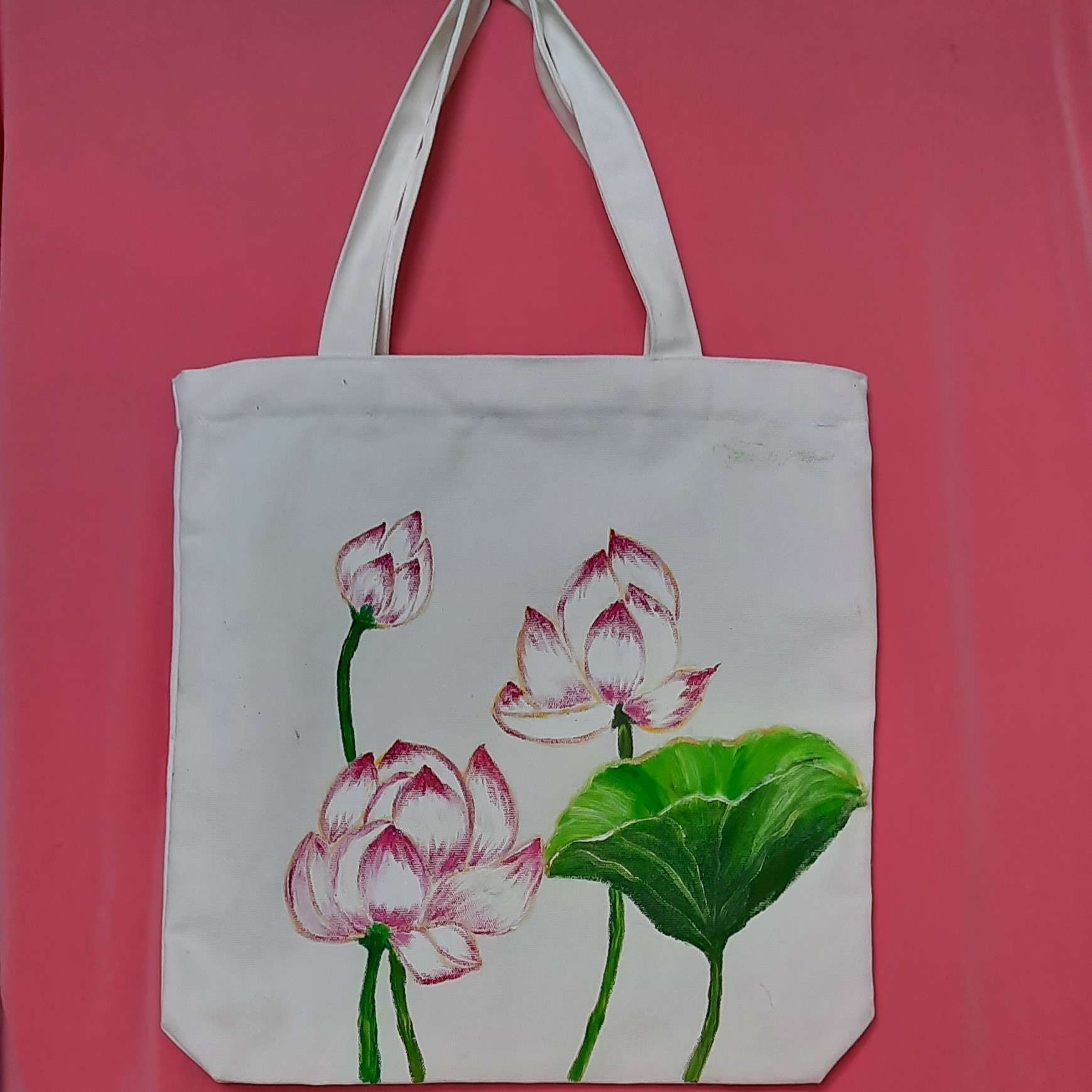 - Túi xách vải bố 1 lớp, có khóa kéo đựng vừa A4 nằm ngang, chất vải mềm, vẽ nghệ thuật bằng chân, làm quà tặng.