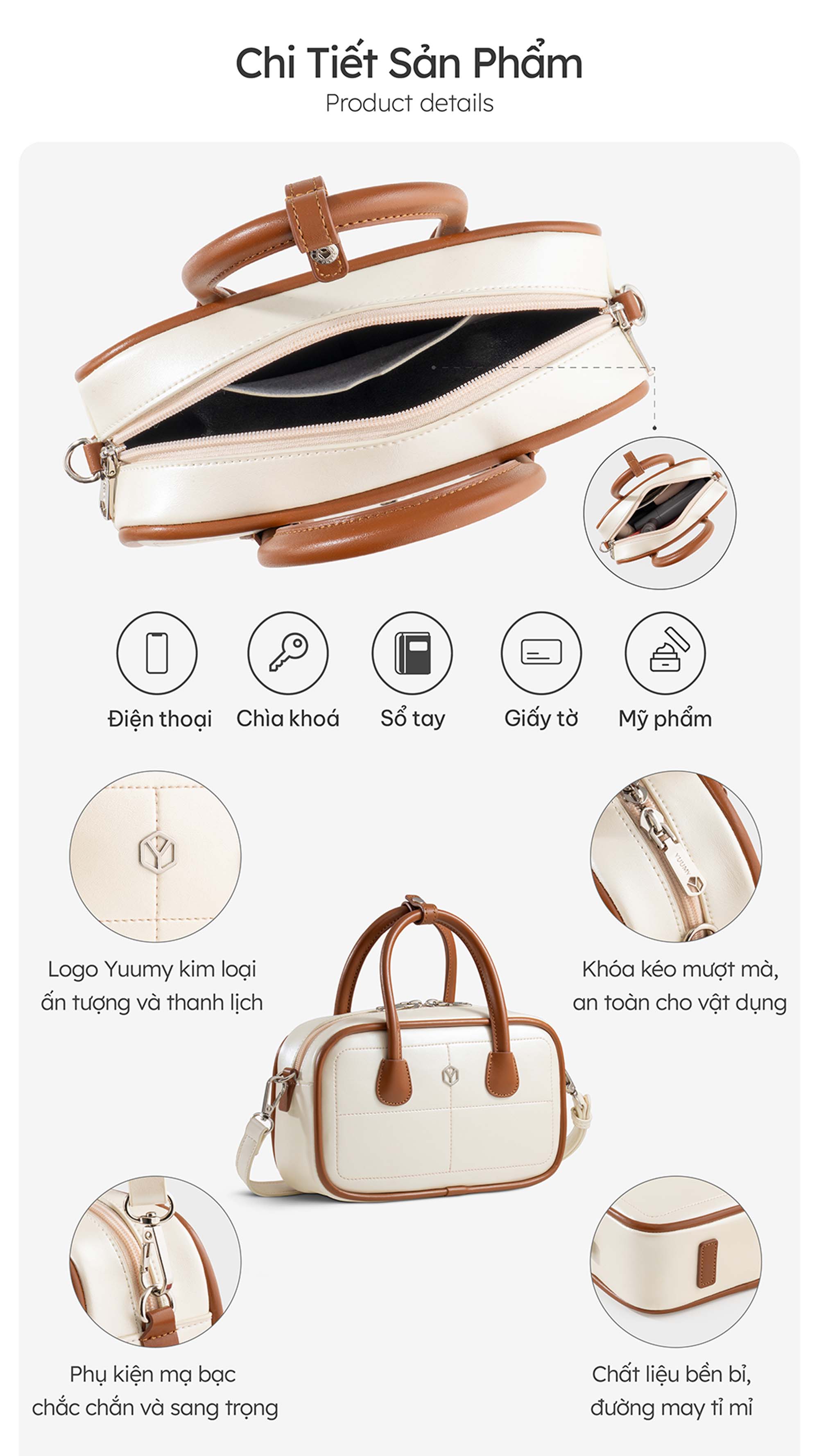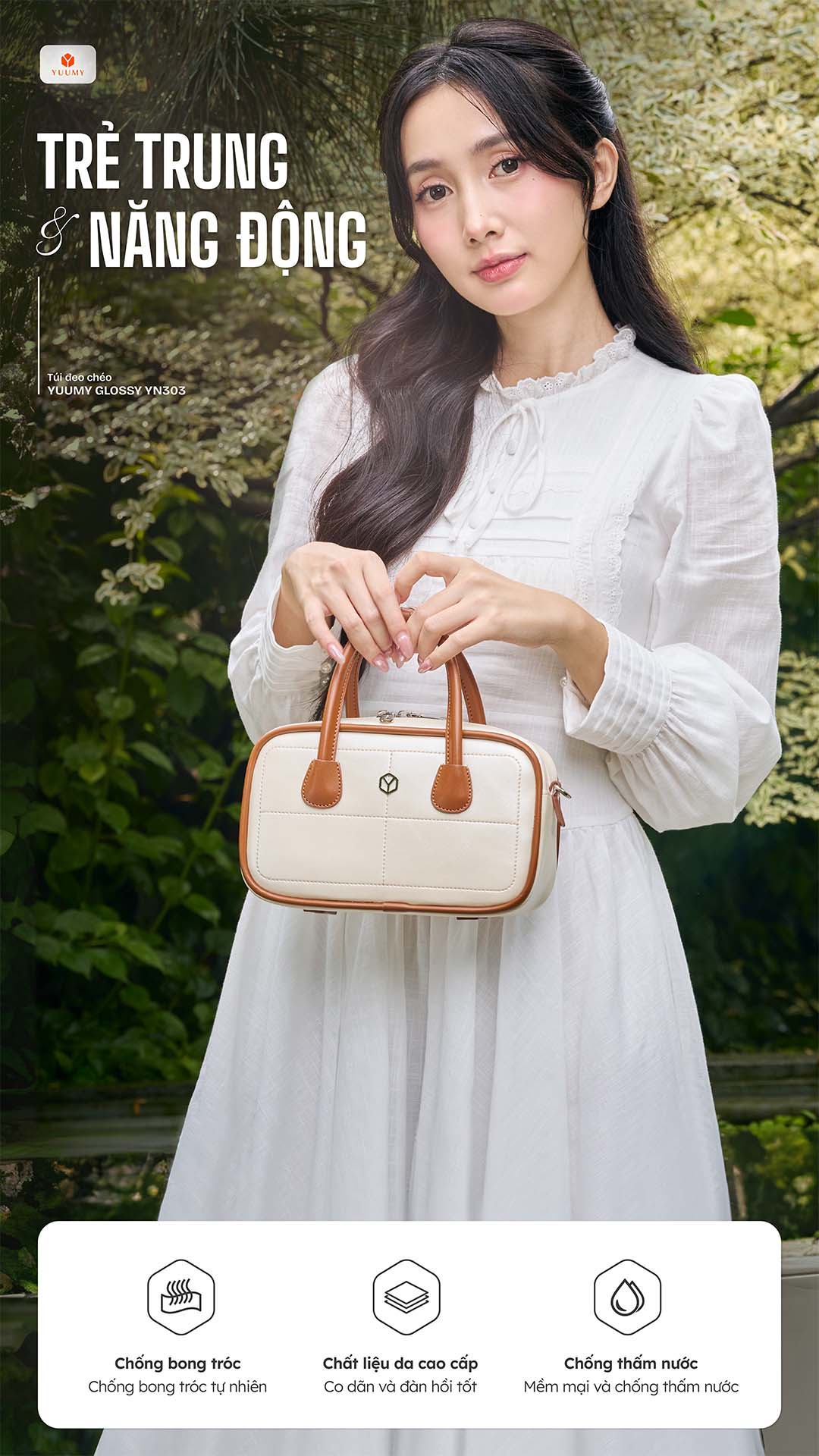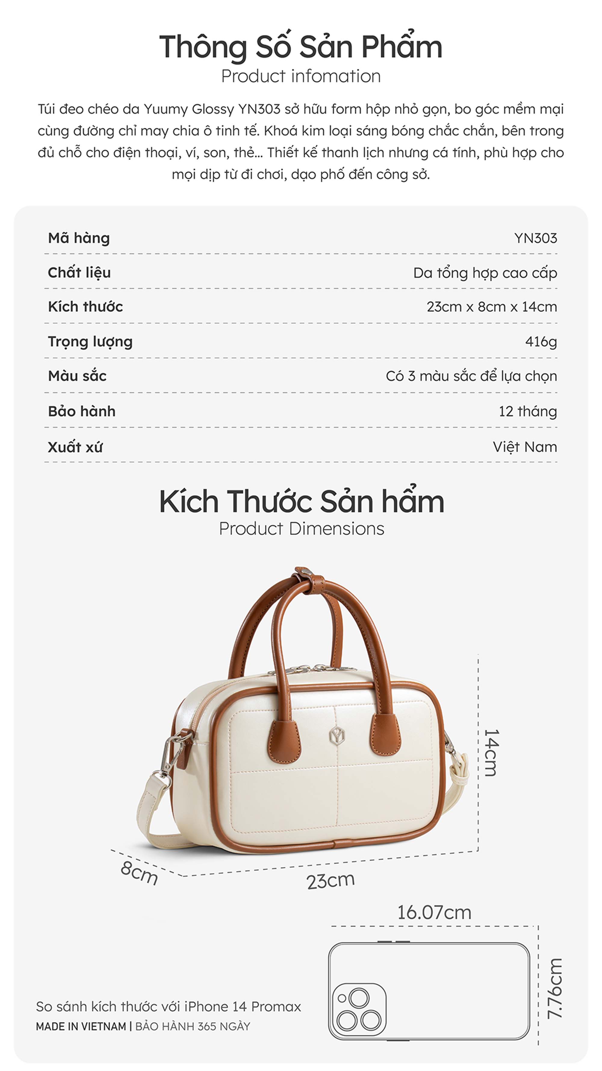 Túi đeo chéo da Yuumy Glossy YN303 với form hộp nhỏ gọn, bo góc mềm mại và đường chỉ may chia ô đối xứng, sản phẩm tạo cảm giác chỉn chu và thời trang trong từng chi tiết. Khoá kéo kim loại sáng bóng giúp đóng mở mượt mà, giữ an toàn cho vật dụng bên trong. Bên trong túi có đủ không gian để đựng các vật dụng thiết yếu như điện thoại, ví tiền, son, thẻ…Dù đi cà phê cuối tuần, dạo phố hay đến công sở, chiếc túi này đều dễ dàng nâng tầm phong cách cho bạn – nữ tính mà vẫn cá tính.THÔNG SỐ KỸ THUẬT: