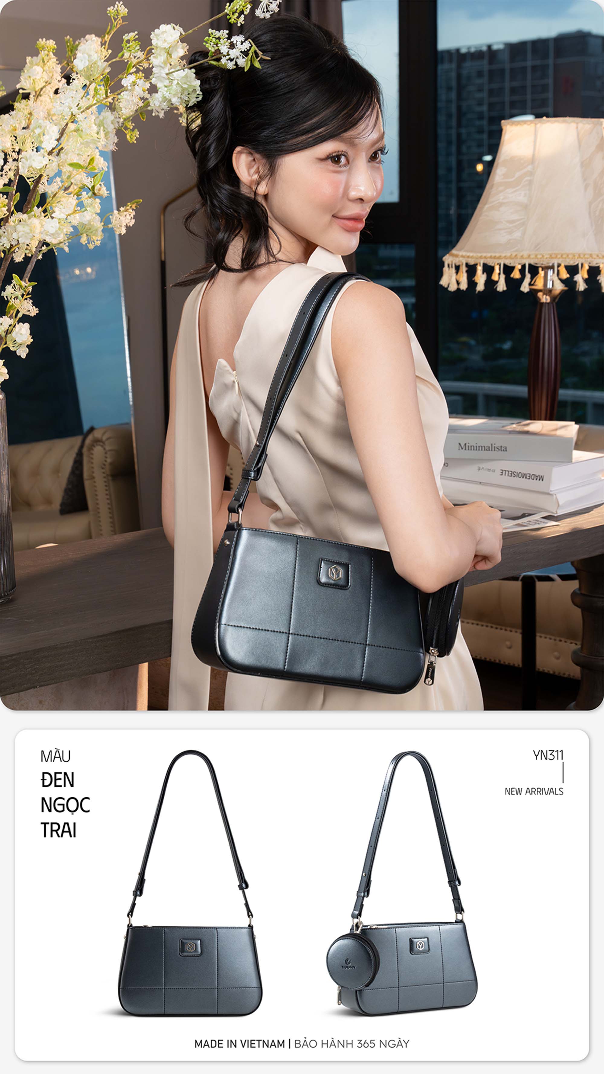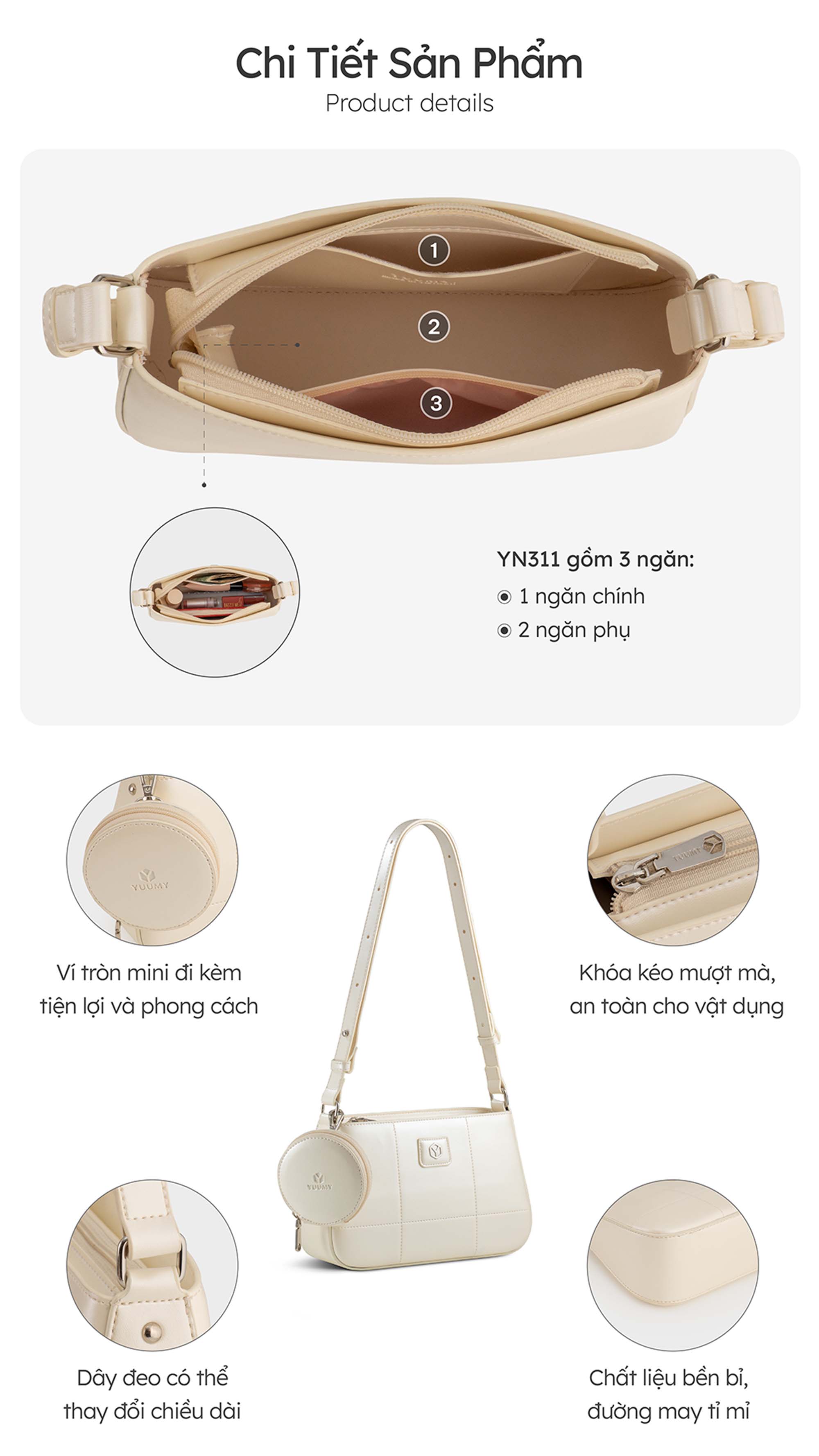 Thanh lịch, nhỏ gọn nhưng vẫn nổi bật – Túi đeo chéo Glossy Yuumy YN311 là lựa chọn hoàn hảo cho những cô nàng yêu sự tinh tế và tiện lợi. Thiết kế dáng hộp hiện đại kết hợp cùng ví tròn mini đi kèm, giúp bạn vừa tăng điểm phong cách vừa dễ dàng mang theo những vật dụng nhỏ xinh. Chất liệu da tổng hợp cao cấp với bề mặt nhẵn mịn, đường may tỉ mỉ và logo kim loại sang trọng tạo nên vẻ đẹp tinh tế, bền bỉ theo thời gian. Túi có 3 gam màu thời thượng dễ dàng mix&match cùng nhiều outfit từ dạo phố, đi làm đến dự tiệc nhẹ. Ngoài ra, túi có dây đeo điều chỉnh linh hoạt, có thể đeo chéo hoặc kẹp nách. Với YN311 bạn không chỉ mang theo đồ dùng cần thiết mà còn mang theo cả sự tự tin và phong cách.