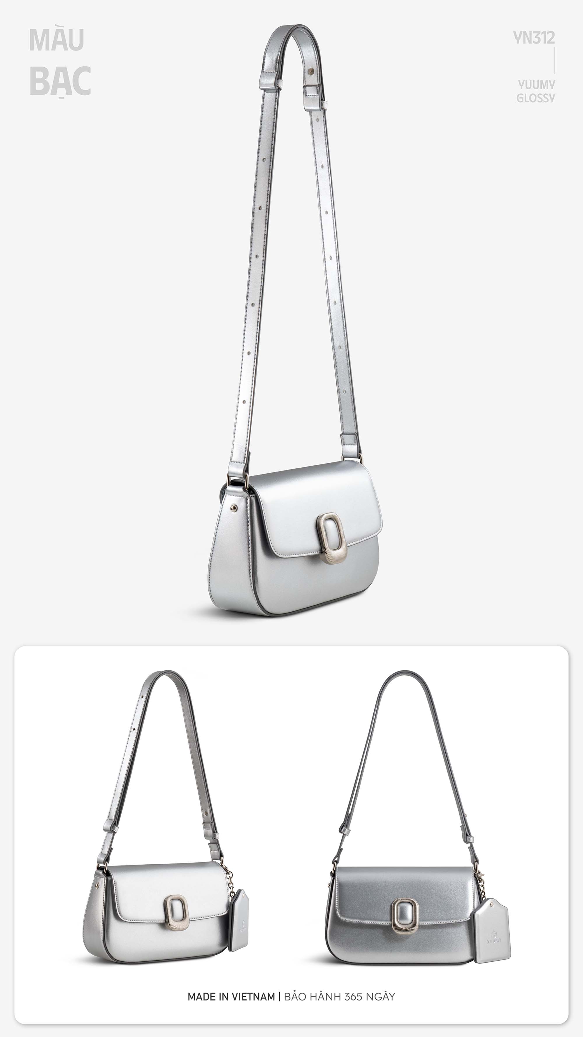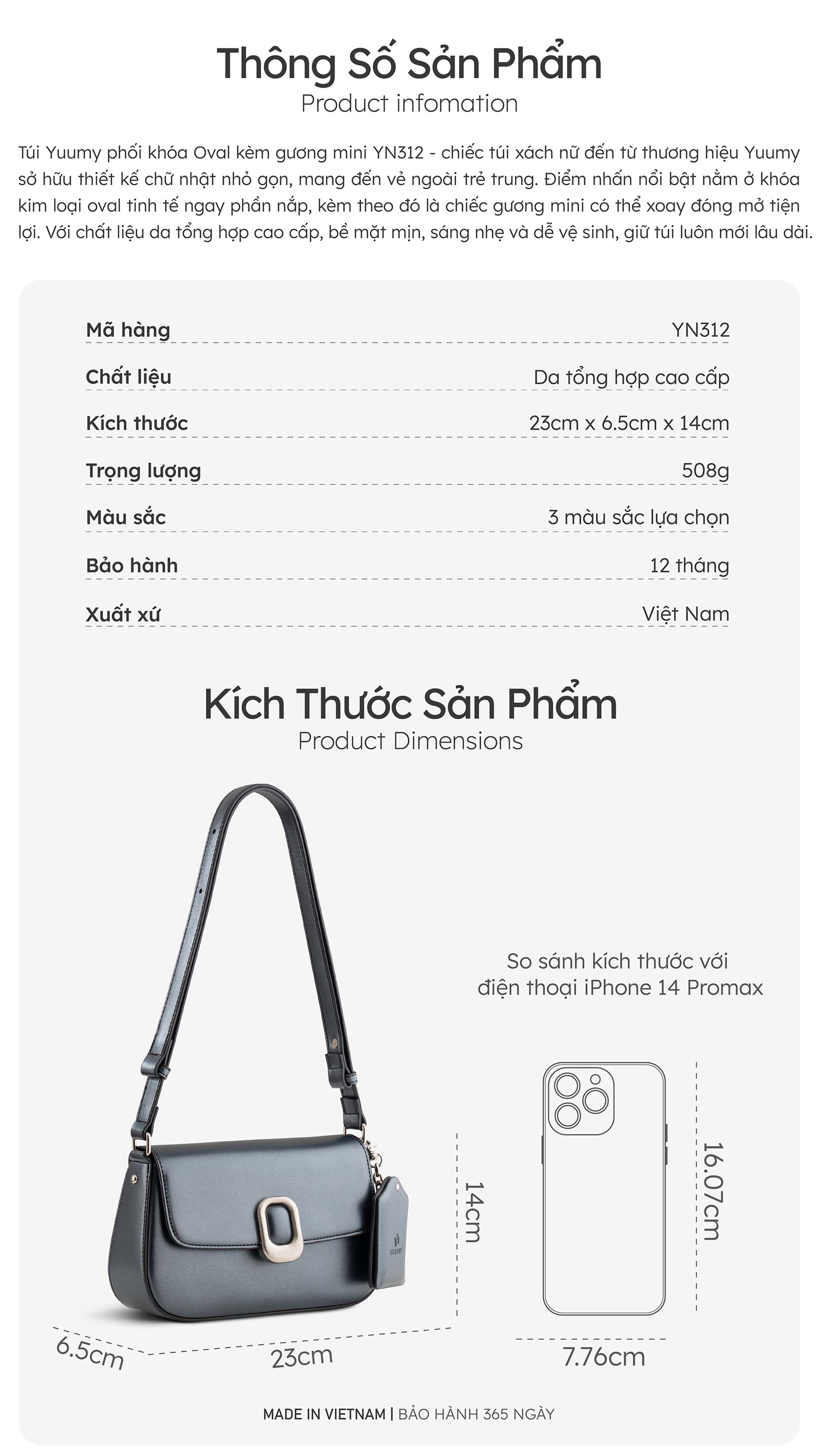 Túi Yuumy phối khóa Oval kèm gương mini YN312 - chiếc túi xách nữ đến từ thương hiệu Yuumy sở hữu thiết kế chữ nhật nhỏ gọn, mang đến vẻ ngoài trẻ trung. Điểm nhấn nổi bật nằm ở khóa kim loại oval tinh tế ngay phần nắp, kèm theo đó là chiếc gương mini có thể xoay đóng mở tiện lợi. Với chất liệu da tổng hợp cao cấp, bề mặt mịn, sáng nhẹ và dễ vệ sinh, giữ túi luôn mới lâu dài. Sản phẩm có 4 ngăn tiện dụng đựng vừa điện thoại, ví tiền, mỹ phẩm, chìa khóa…Dây đeo bản vừa có thể điều chỉnh linh hoạt, phù hợp cả đeo vai lẫn đeo chéo.