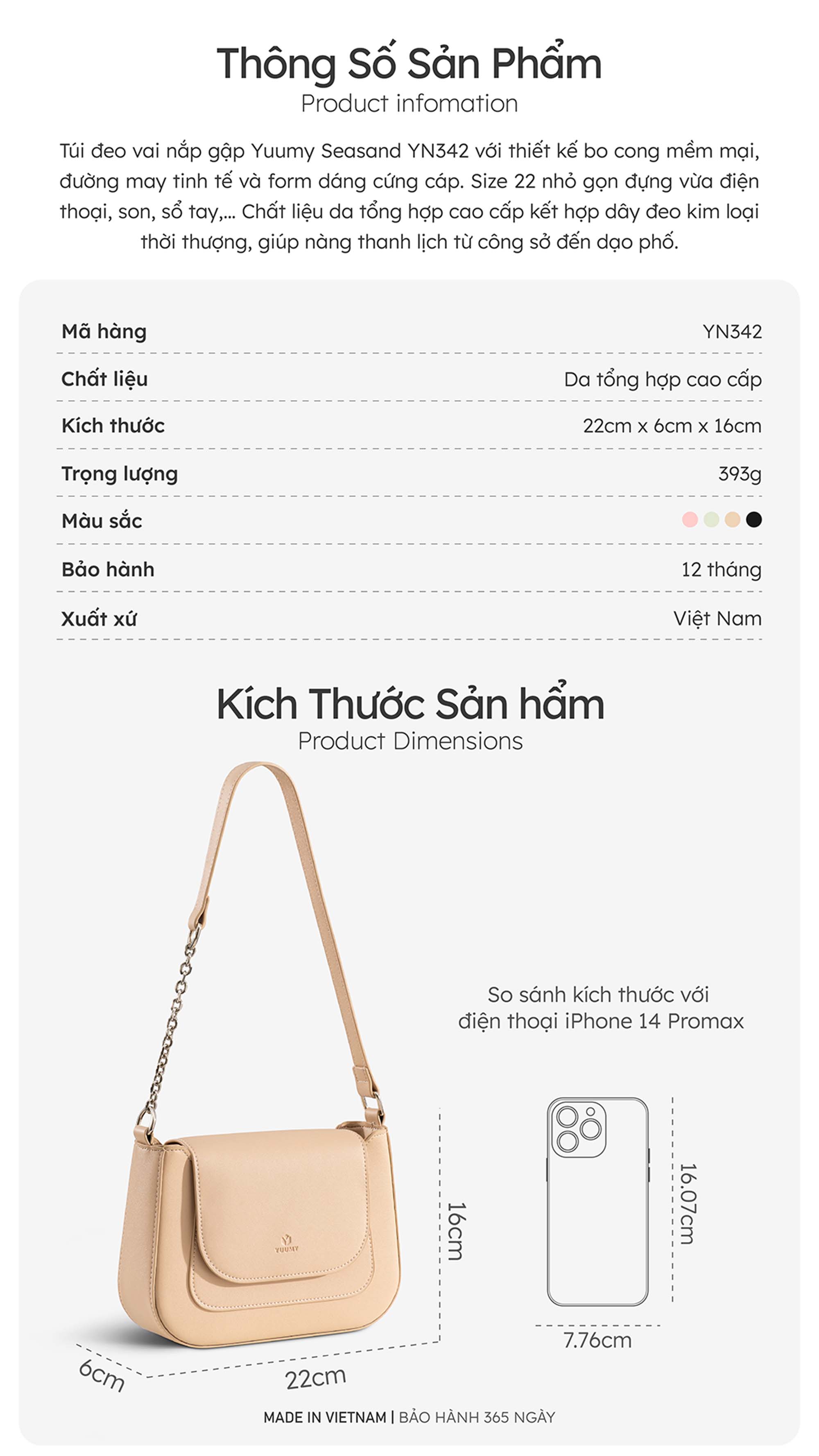 Túi đeo vai nắp gập Yuumy Seasand YN342 là hiện thân của phong cách tối giản thanh lịch, với thiết kế bo cong mềm mại cùng đường chỉ may chỉnh chu. Túi có kích thước size 22 đựng vừa cho nàng điện thoại, son, sổ tay và vật dụng cá nhân tiện lợi. Cùng chất liệu da tổng hợp cao cấp, form túi cứng cáp, phối dây đeo kim loại thời thượng – YN342 không chỉ phù hợp cho nàng đi làm, đi chơi mà còn là điểm nhấn tinh tế cho mọi outfit.