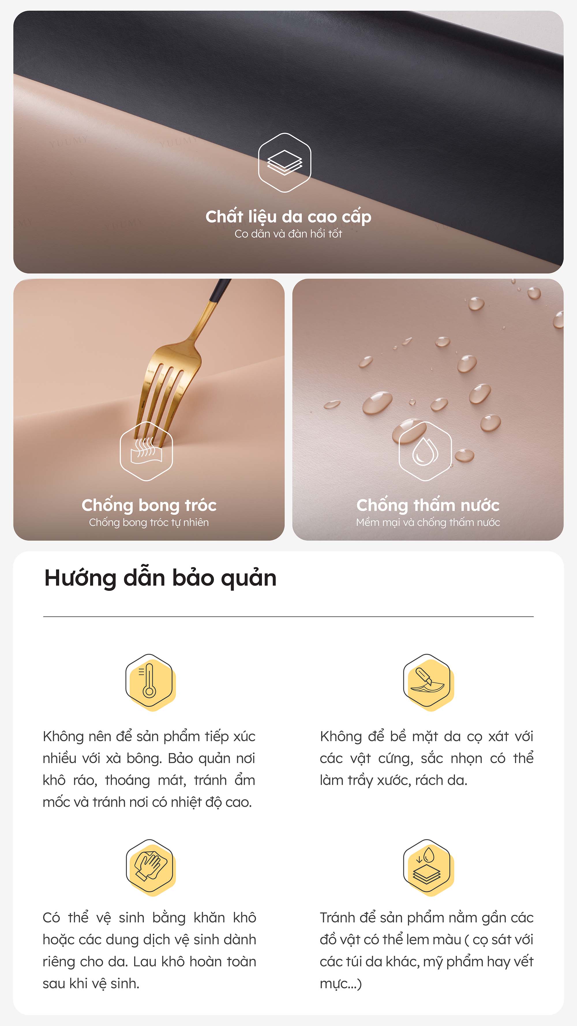 - Có thể vệ sinh bằng khăn khô hoặc các dung dịch vệ sinh dành riêng cho da