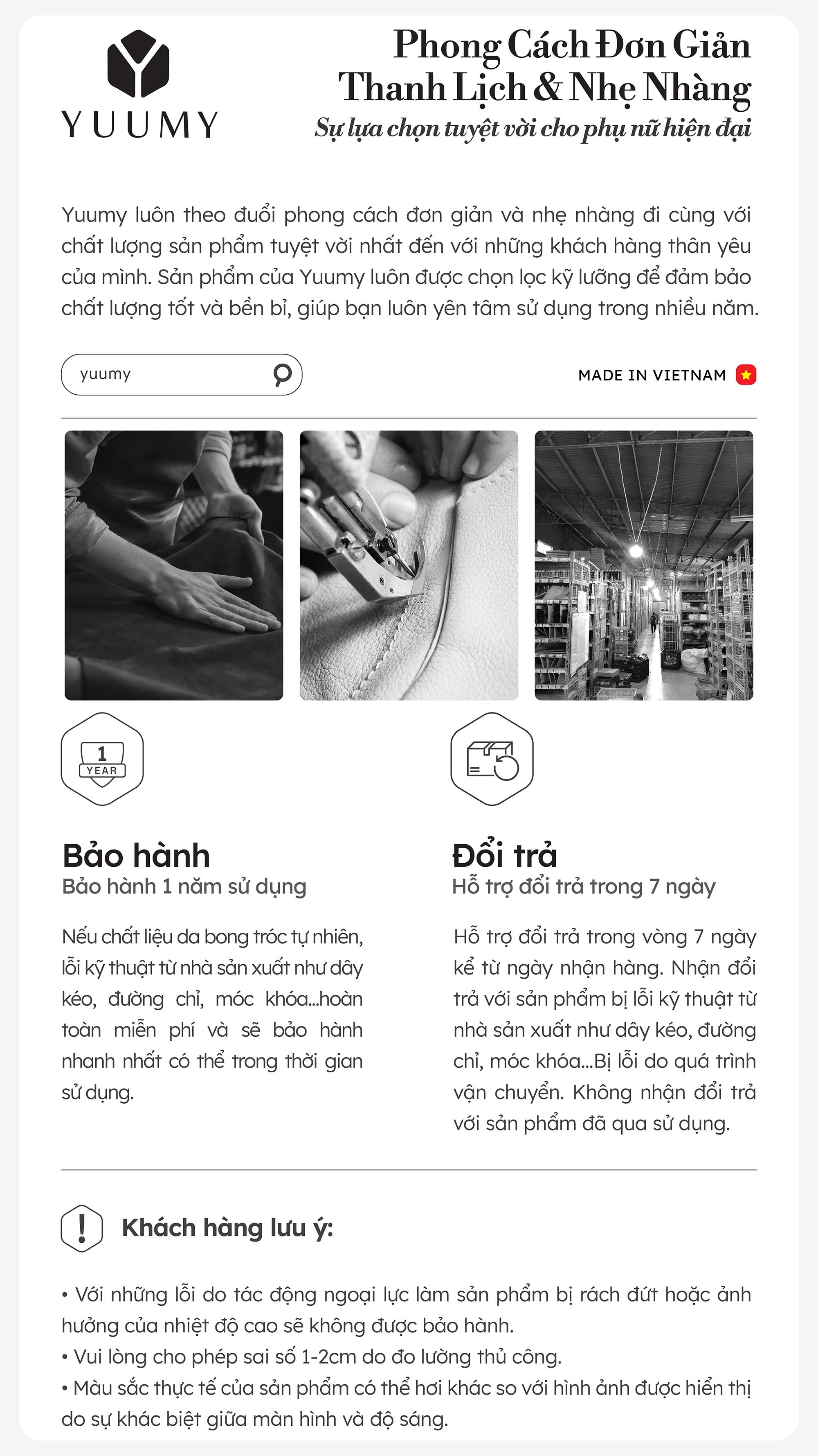 - Nhận đổi trả với sản phẩm bị lỗi kỹ thuật từ nhà sản xuất như dây kéo, đường chỉ, móc khóa…
