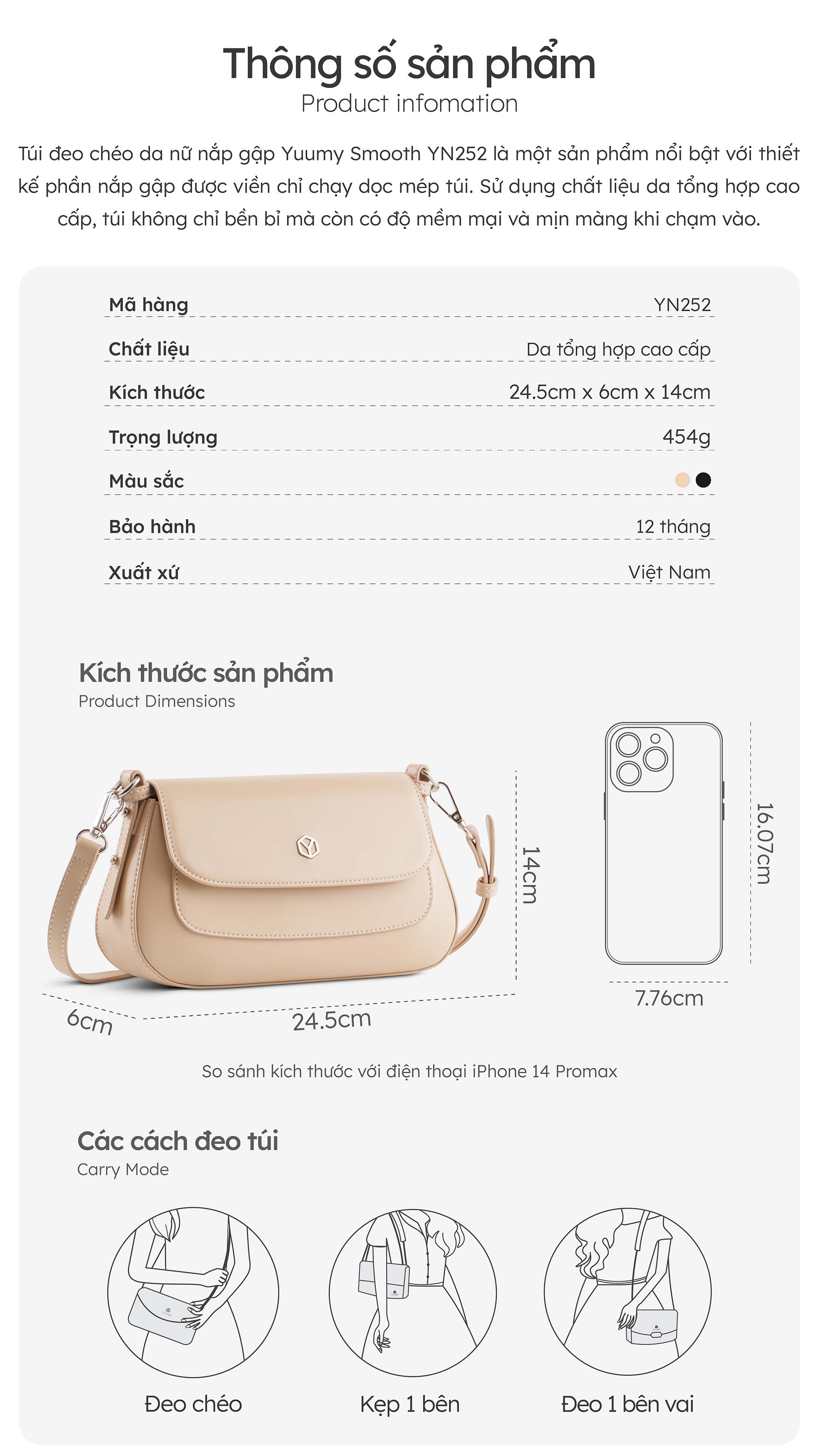 Túi đeo chéo da nữ nắp gập Yuumy Smooth YN252 là một sản phẩm nổi bật với thiết kế phần nắp gập được viền chỉ chạy dọc mép túi. Sử dụng chất liệu da tổng hợp cao cấp, túi không chỉ bền bỉ mà còn có độ mềm mại và mịn màng khi chạm vào, độ bóng nhẹ trên bề mặt da làm tăng thêm sự thu hút. Túi có kích thước vừa phải, phù hợp mang theo các vật dụng cần thiết như điện thoại, ví tiền, mắt kính,...đáp ứng nhu cầu sử dụng hàng ngày của chị em phụ nữ. Một điểm độc đáo của chiếc túi là được thiết kế 2 loại dây đeo chéo và dây đeo vai, giúp chị em dễ dàng thay đổi phong cách trong mọi dịp dù là đi làm hay đi dạo phố,...