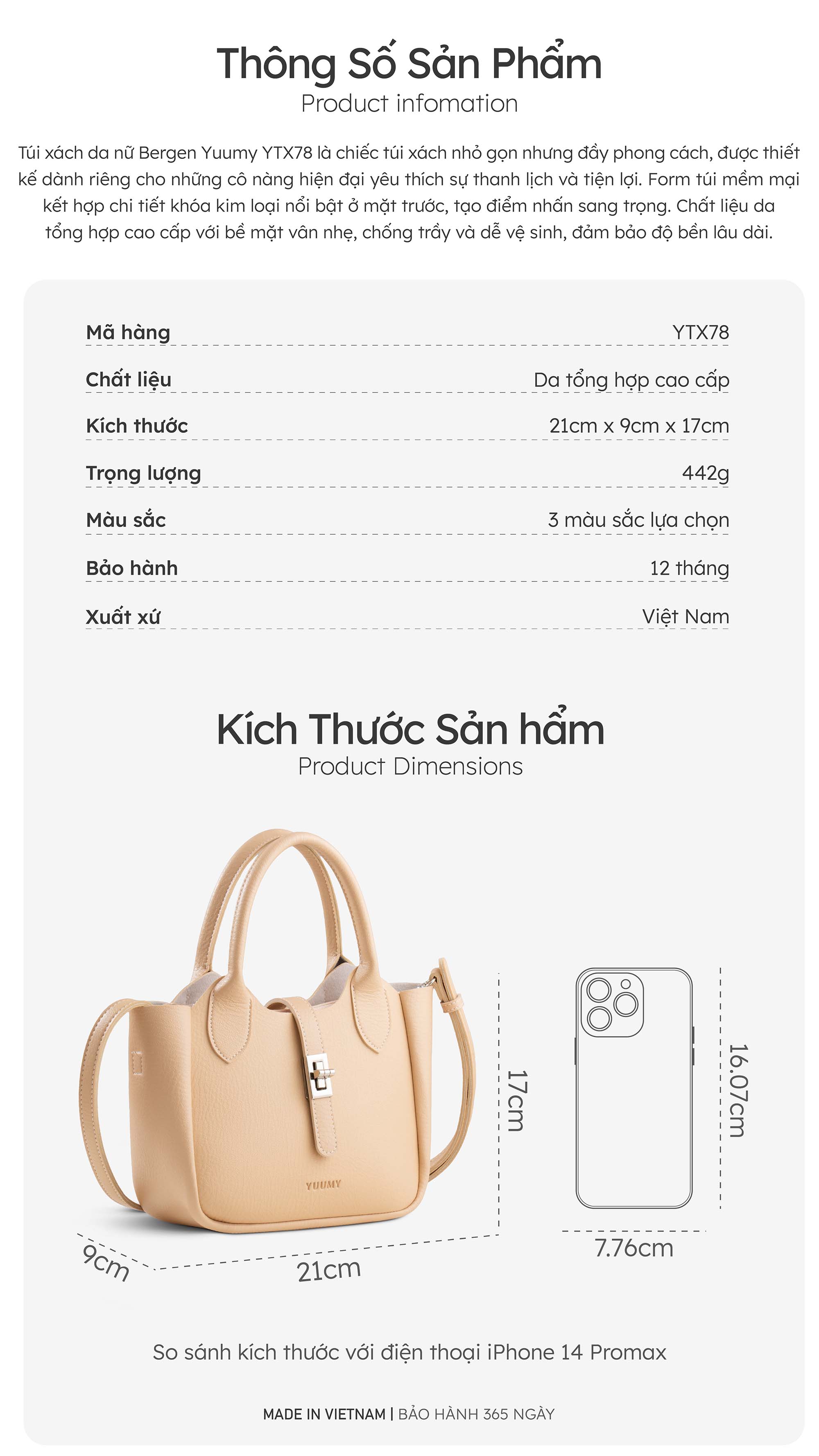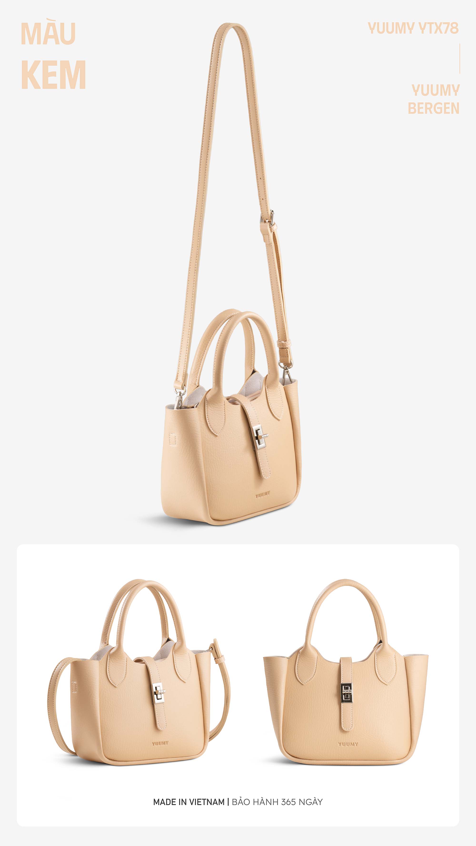 Túi xách da nữ Bergen Yuumy YTX78 là chiếc túi xách nhỏ gọn nhưng đầy phong cách, được thiết kế dành riêng cho những cô nàng hiện đại yêu thích sự thanh lịch và tiện lợi. Form túi mềm mại kết hợp chi tiết khóa kim loại nổi bật ở mặt trước, tạo điểm nhấn sang trọng. Chất liệu da tổng hợp cao cấp với bề mặt vân nhẹ, chống trầy và dễ vệ sinh, đảm bảo độ bền lâu dài. Túi dễ dàng phối cùng nhiều outfit từ công sở đến dạo phố. Ngăn túi rộng rãi vừa đủ đựng ví, điện thoại, mỹ phẩm nhỏ… kèm quai xách tay chắc chắn và dây đeo chéo tiện lợi, giúp bạn linh hoạt trong mọi hoàn cảnh. Chiếc túi này không chỉ là phụ kiện mà còn là tuyên ngôn phong cách – nhỏ xinh nhưng nổi bật ở mọi nơi bạn xuất hiện.