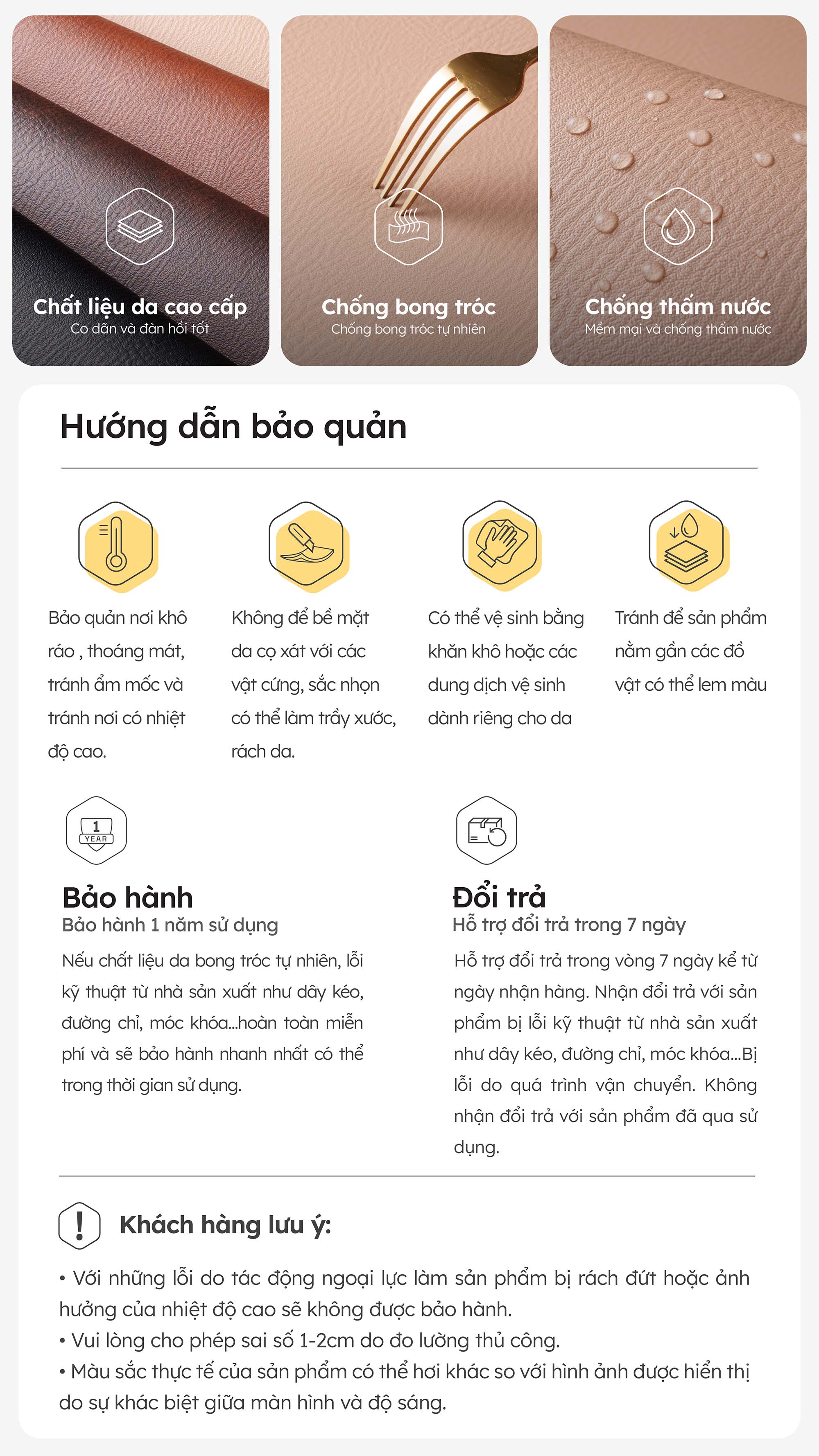 - Có thể vệ sinh bằng khăn khô hoặc các dung dịch vệ sinh dành riêng cho da