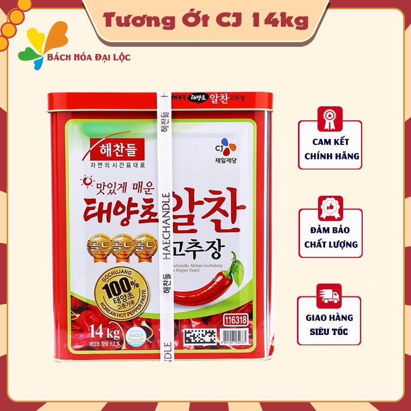 ➡️ TÊN SẢN PHẨM: Tương Ớt Hàn Quốc Thùng 14kg ➡️ THÔNG TIN SẢN PHẨM: - Xuất xứ : Hàn Quốc - Hạn sử dụng: 12 tháng kể từ ngày sản xuất in trên bao bìa sản phẩm - Đóng gói: Thùng 14kg - Thành Phần: Lúa mì, bột mì, bột ớt, hỗn hợp ngũ cốc, đậu nành, gạo nếp, mạch nha, gia vị muối hành tỏi.... - Công Dụng : Làm gia vị chế biến các món ăn * Tương ớt Hàn Quốc đóng gói thành túi 100g tiện lợi cho khách hàng dễ dàng sử dụng và bảo quản. Là loại gia vị chuyên dùng để nấu bánh gạo, nấu mì cay, làm kim chi hay các món ăn mang phong cách Hàn Quốc. - Bảo quản: Ngăn mát, tránh ánh nắng trực tiếp