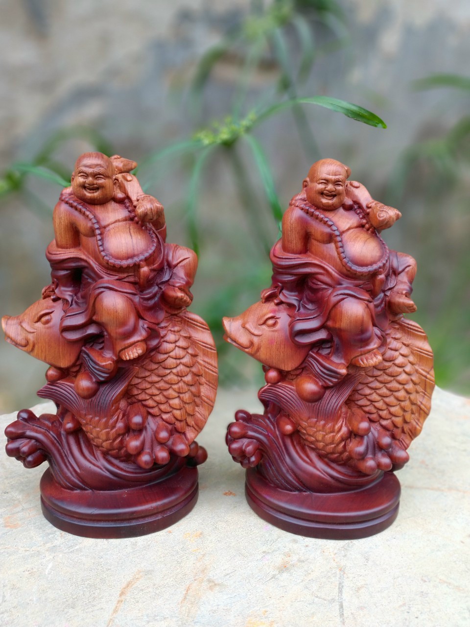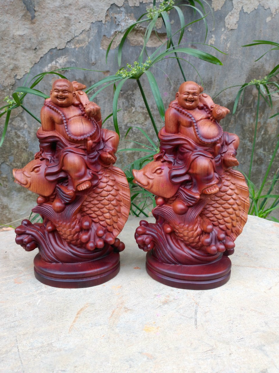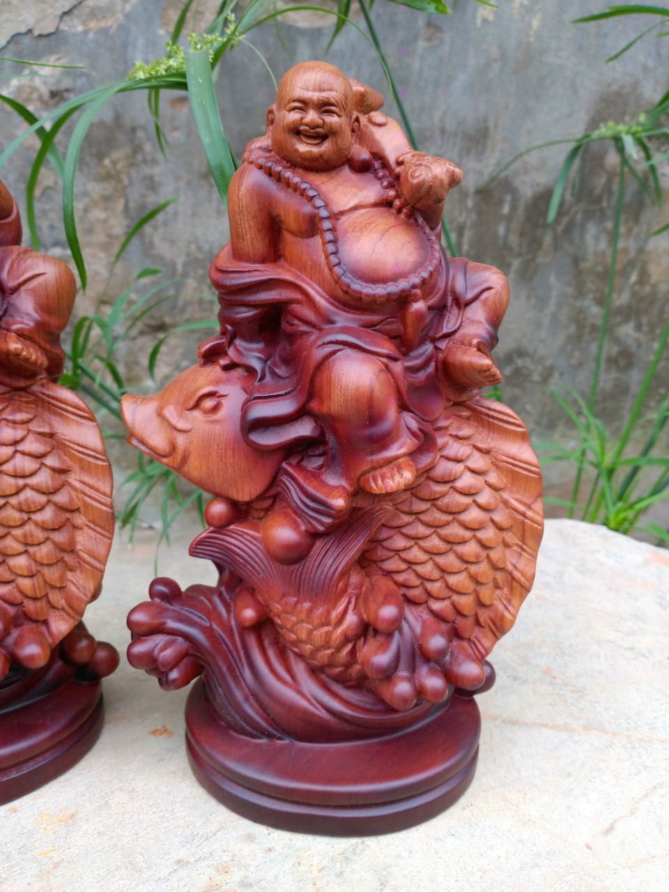 _ Tượng phật di lặc cưỡi cá chép được làm bằng chất liệu gỗ hương đá liền khối tự nhiên 100% ,Và được sơn pu phun bóng tô mầu giả cổ
