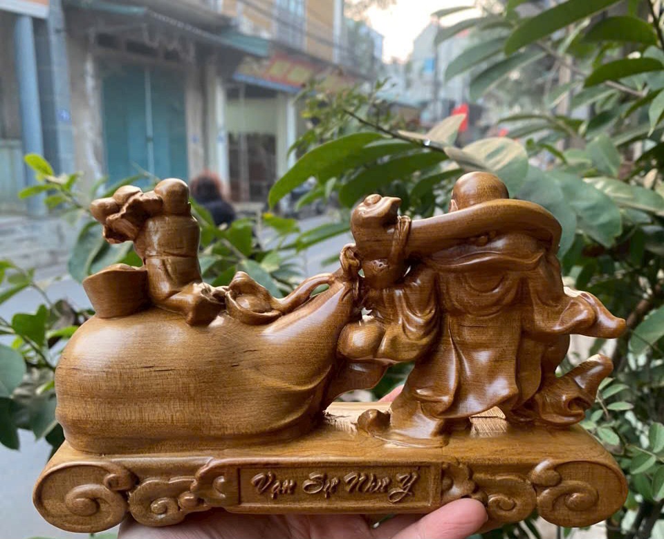 _ Tượng phật di lặc kéo bao vàng mini để ôtô,trang trí bàn học bàn làm việc được làm bằng chất liệu gỗ bách xanh liền khối tự nhiên 100%