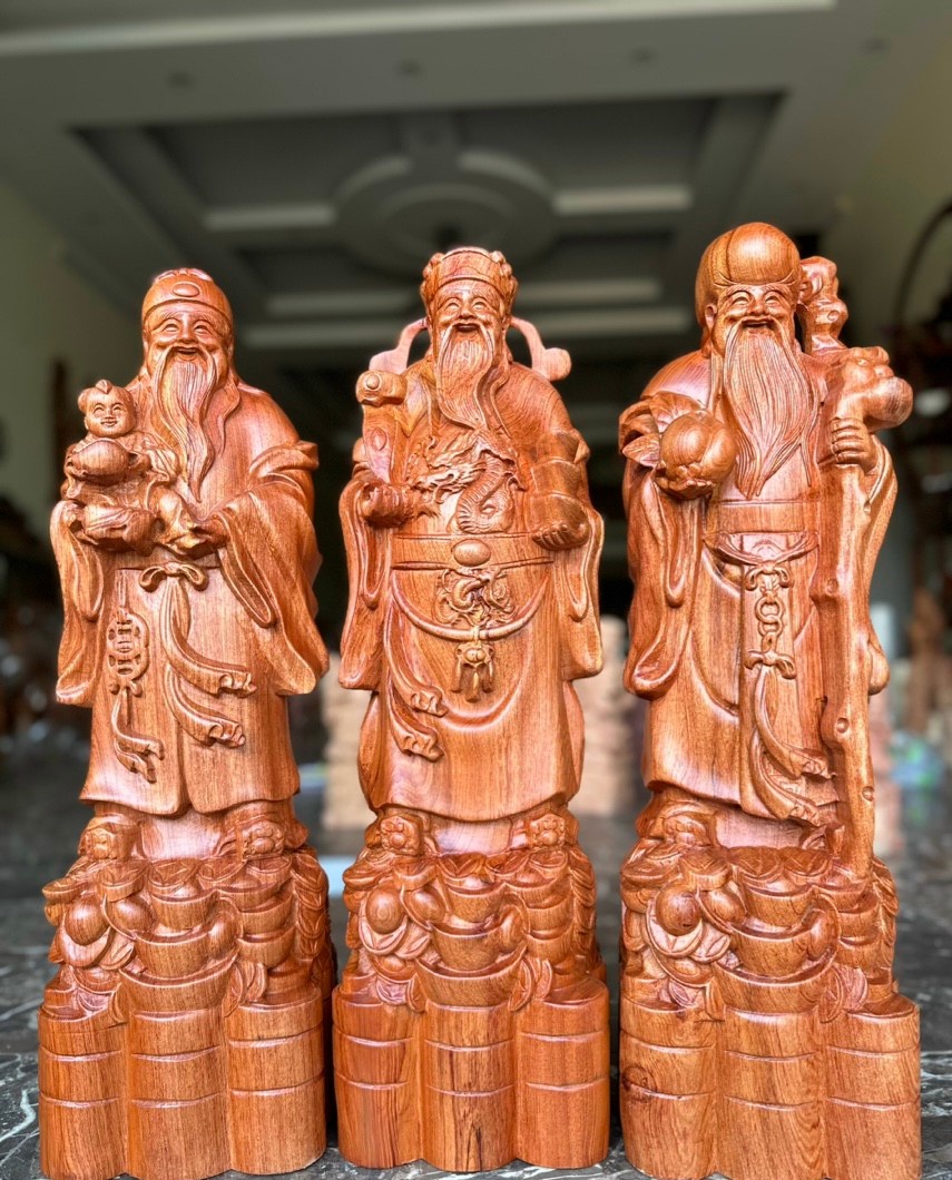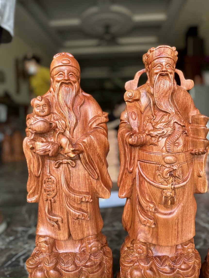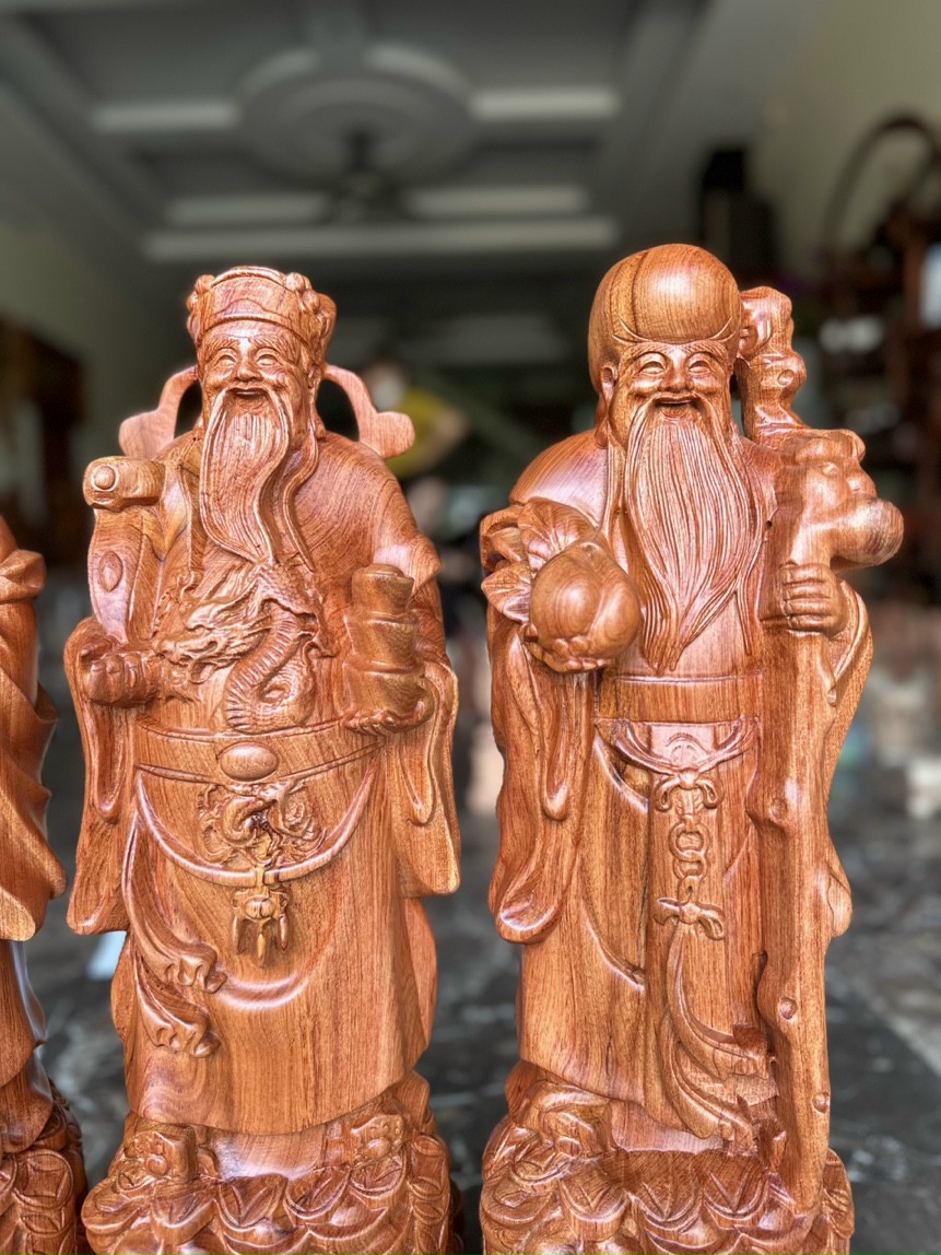 _ Bộ tượng phật được trạm khắc tỉ mỉ ,tinh sảo kỳ công .Đi hầu hết tất cả mọi chi tiết góc ngách nội dung hoa văn của tượng đều được gọt tỉa chỉnh sửa sắc nét hoàn toàn bằng tay thủ công .Đồng thời bộ tam tam được kiểm định kỹ lưỡng khắt khe ,như cho vào thẩm sấy cho gỗ khô kiệt .Mục đích trống dập nứt vênh mo mối mọt .Kết hợp với trà nhám ,đánh giấy giáp nhiều nước sờ mát lạnh .Song cho vào phun lót làm bóng mờ để giữ lại mầu sắc vân gỗ tự nhiên ,.Tượng được làm và hoàn thiện do bàn tay khối óc tài hoa .Từ những người thợ giàu kinh nghiệm ,trong làng nghề truyền thống .Chính vì thế bộ tam đa phúc lộc thọ bằng gỗ hương đá đã đáp ứng đầy đủ mọi tiêu trí cần thiết như ( Đẹp bền rẻ ) Thẩm mỹ nghệ thuật với chất lượng tuyệt vời