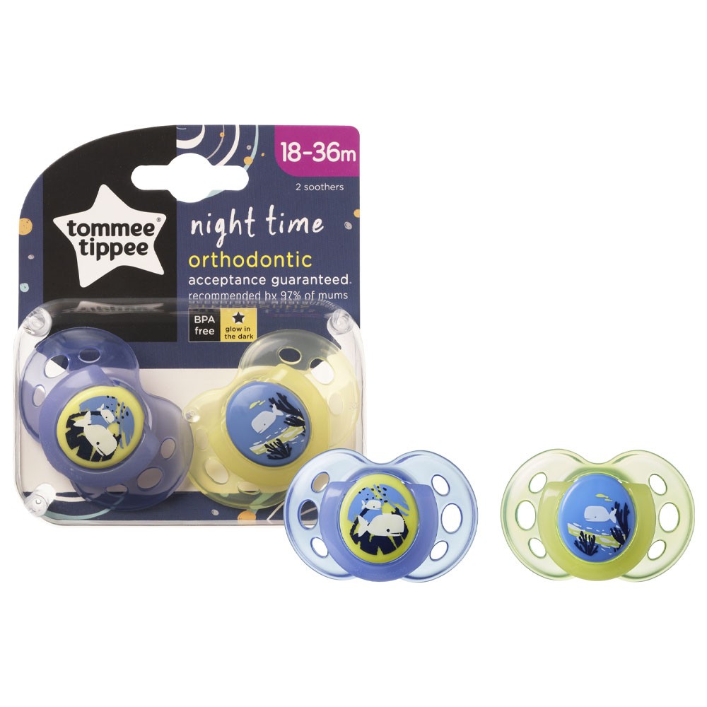 Giới thiệu [Mã BMBAU50 giảm 7% đơn 99K] Ty ngậm dạ quang cho bé Tommee Tippee Night Time 18-36 tháng (vỉ đôi) - Cá Voi