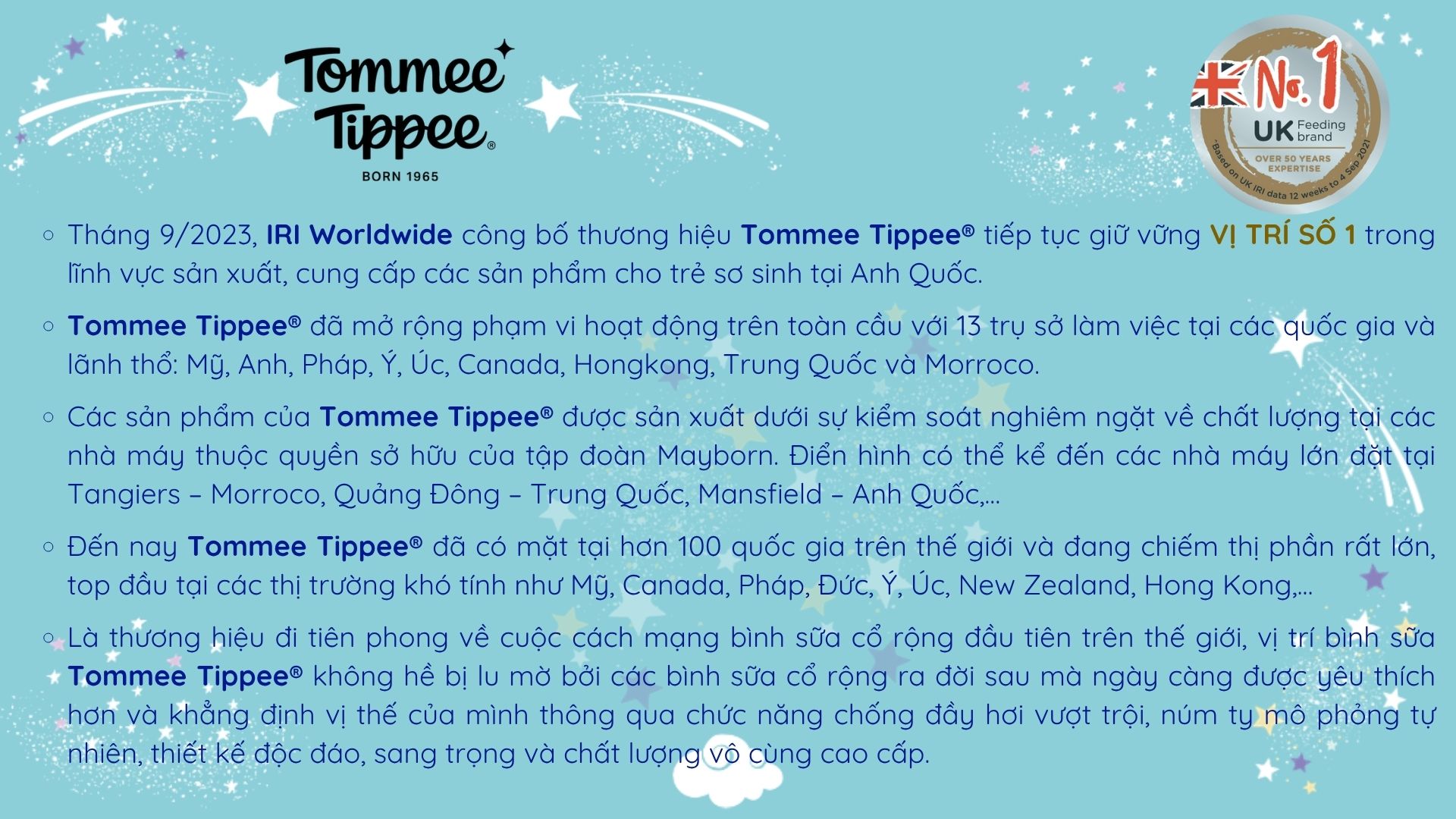 Năm 2020, IRI Worldwide công bố thương hiệu Tommee Tippee tiếp tục giữ vững VỊ TRÍ SỐ1 trong lĩnh vực sản xuất, cung cấp các sản phẩm cho trẻ sơ sinh tại Anh Quốc.